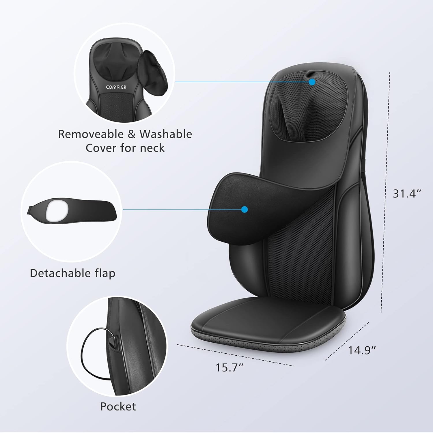 Extra Flap:Comfier neck and back massager with heat also provides massage for the waist and hips. With an additional flap, the Comfier back massagers for back pain deep issue allows you to choose between gentle and intense massages, catering to individual preferences.This shiatsu back massager is 15.7” in length, 14.9” in width and 31.4” in height,which is fit for most standard – sized chairs.