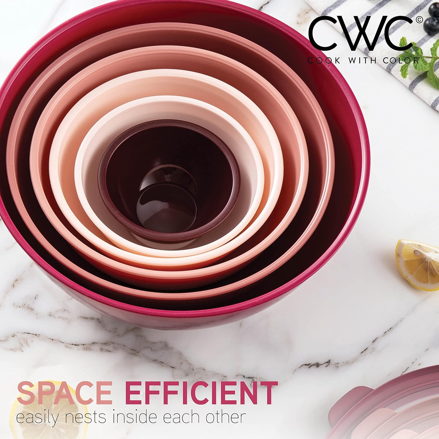 COOK WITH COLOR Mixing Bowls with TPR Lids – 12 Piece Plastic Nesting Bowls Set includes 6 Prep Bowls and 6 Lids, Microwave Safe (Rose)