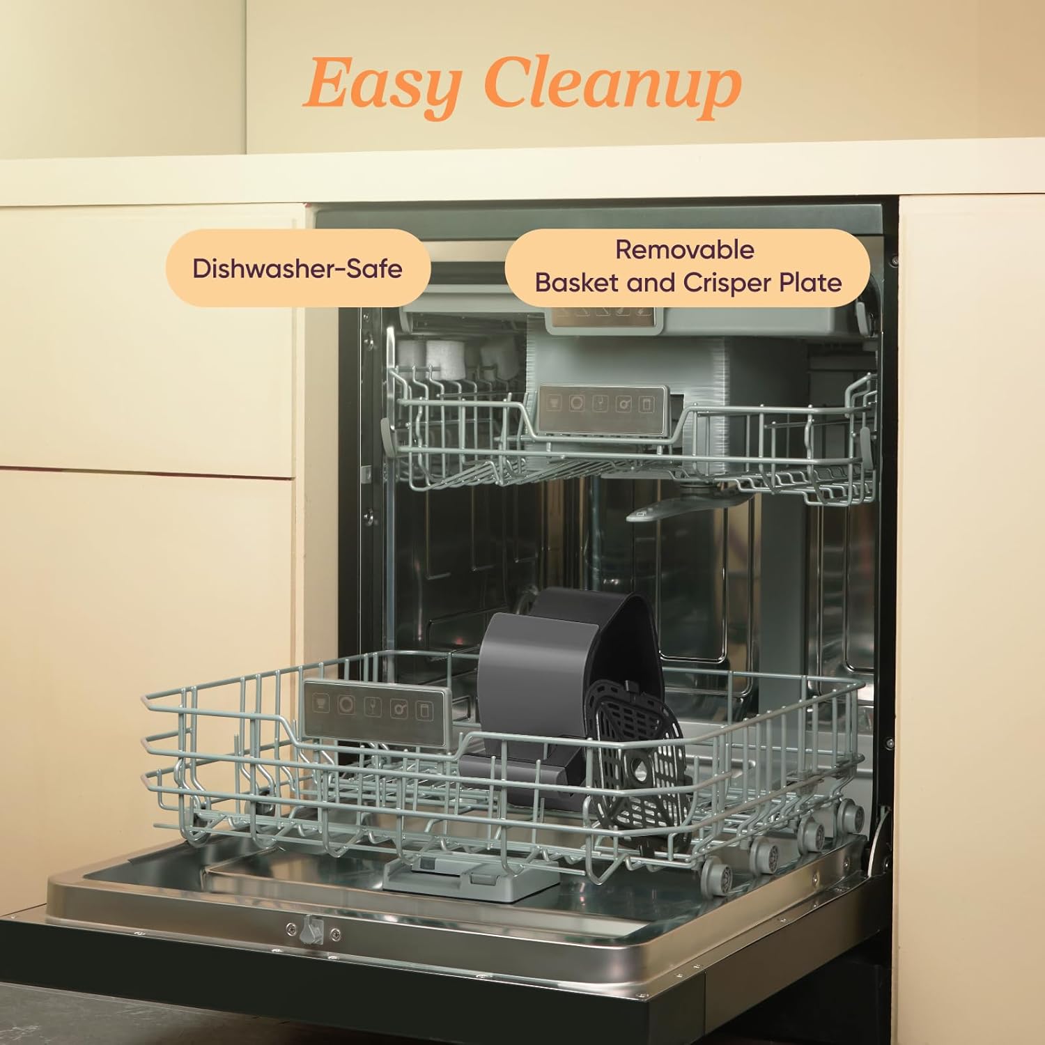 This Air Fryer has a 5.9 x 6.2 x 3.5″ dishwasher-safe basket, you can also choose to get a liner to keep it clean. You can search “air fryer liners 2-3qt” on Amazon, these liners will fits this small air fryer well. Or purchase our COSORI papaer liners “B0BSFP5989”, but better to fold it when use in case of touch to the heat element on the top causing it to burn.