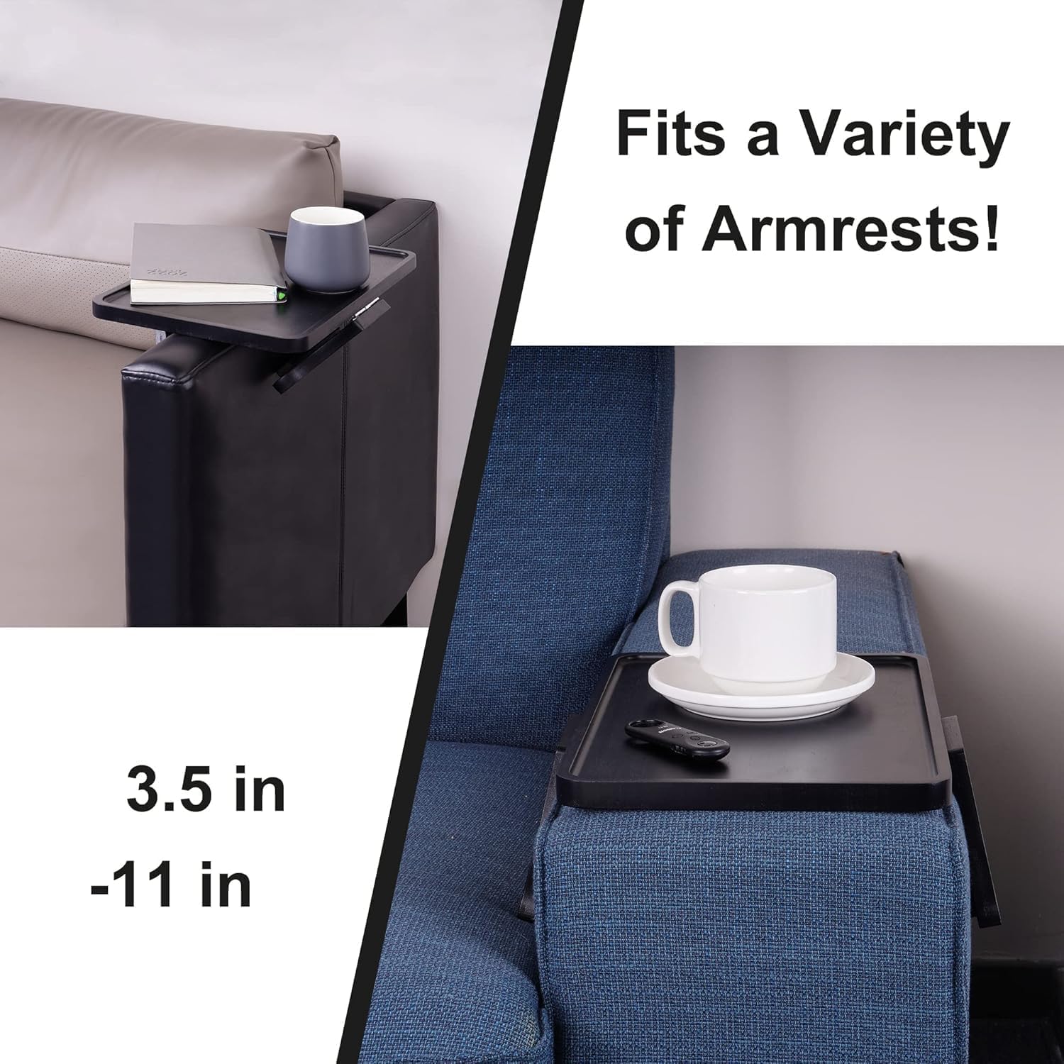 ADJUSTABLE FOR ANY SOFA: Designed to fit armrests 3.5–11 inches wide, our tray works with most couch, loveseat, and recliner styles—from plush fabric to sleek leather. Simply adjust the clips for a customized fit, and enjoy a stable platform that adapts to your furniture’s unique dimensions. (Pro tip: Measure your armrest width for a perfect match!)