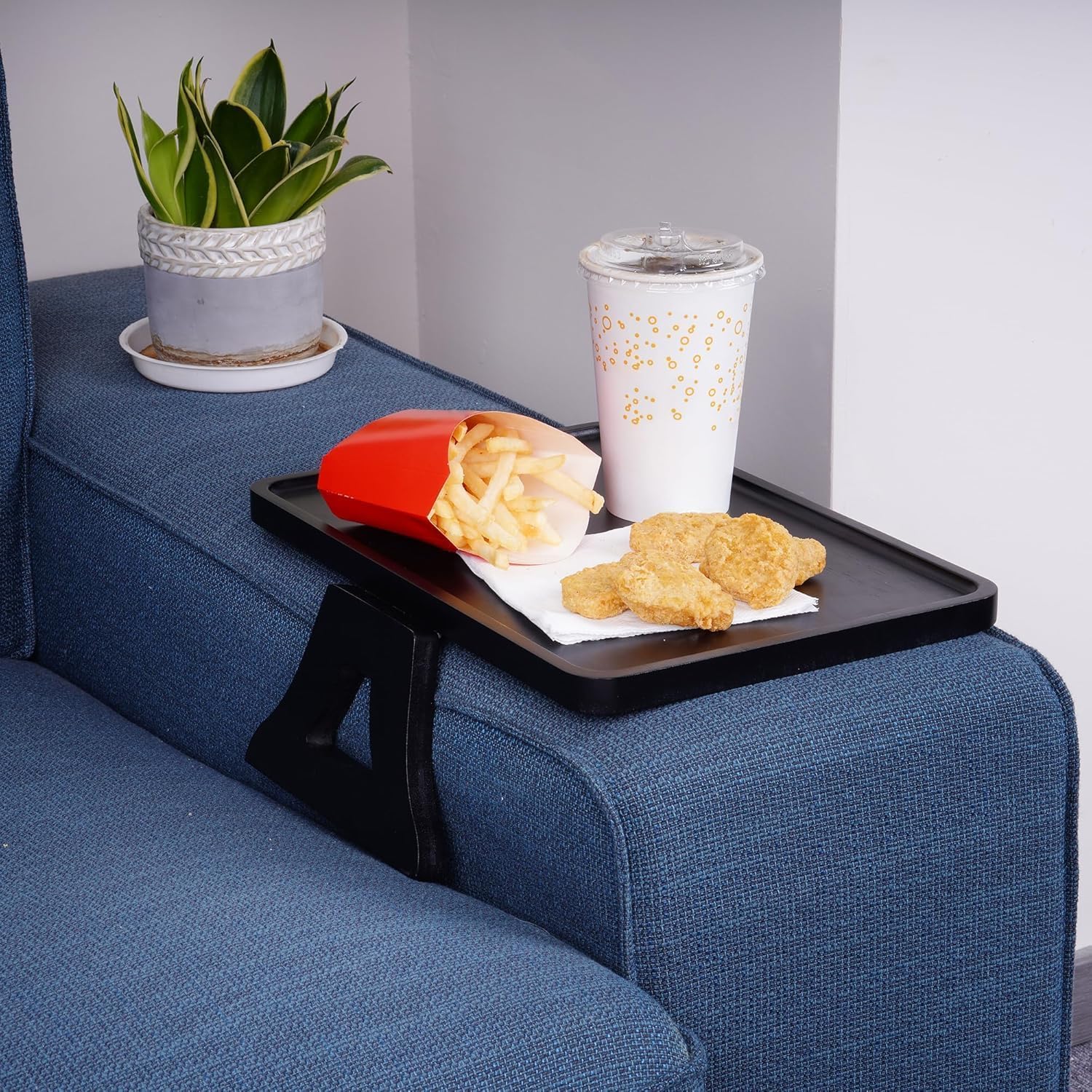MULTI-PURPOSE PORTABILITY: Transform your sofa into a versatile workstation or dining hub! This clip-on tray offers a stable surface for meals, laptops, tablets, remotes, and drinks, eliminating the need to juggle items or clutter side tables. Perfect for cozy movie nights, remote work sessions, or casual snacking—keep everything you need within arm’s reach without compromising comfort!