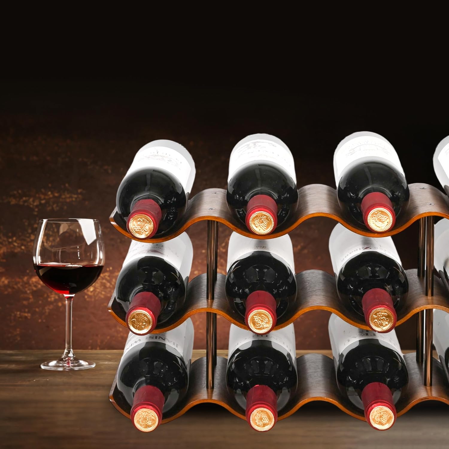 Countertop Wine Rack – 12 Bottle Freestanding Wine Bottle Holder Stand – 3 Tier Wooden Wine Storage Rack – Walnut Wavy Wine Organizer for Cabinet Pantry Home Kitchen Bar