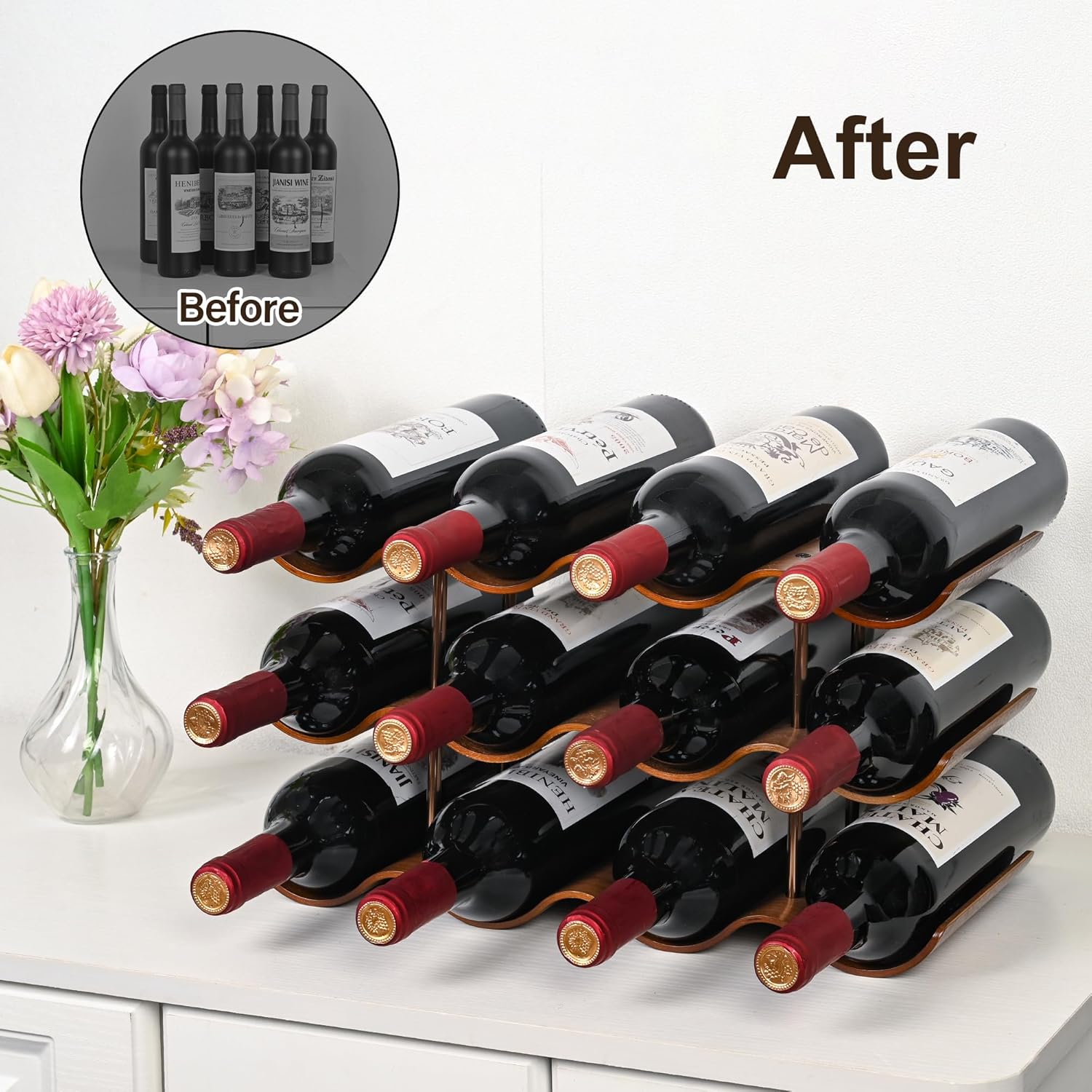 Compact Design – This wine rack holds 12 wine bottles in a freestanding, 3 tier design. The compact size allows for easy placement in cabinet or on any countertop or table. Perfect for storing and organizing your favorite wine bottles in one convenient location. Keeps your wine bottles within reach for easy access when entertaining or for daily use.