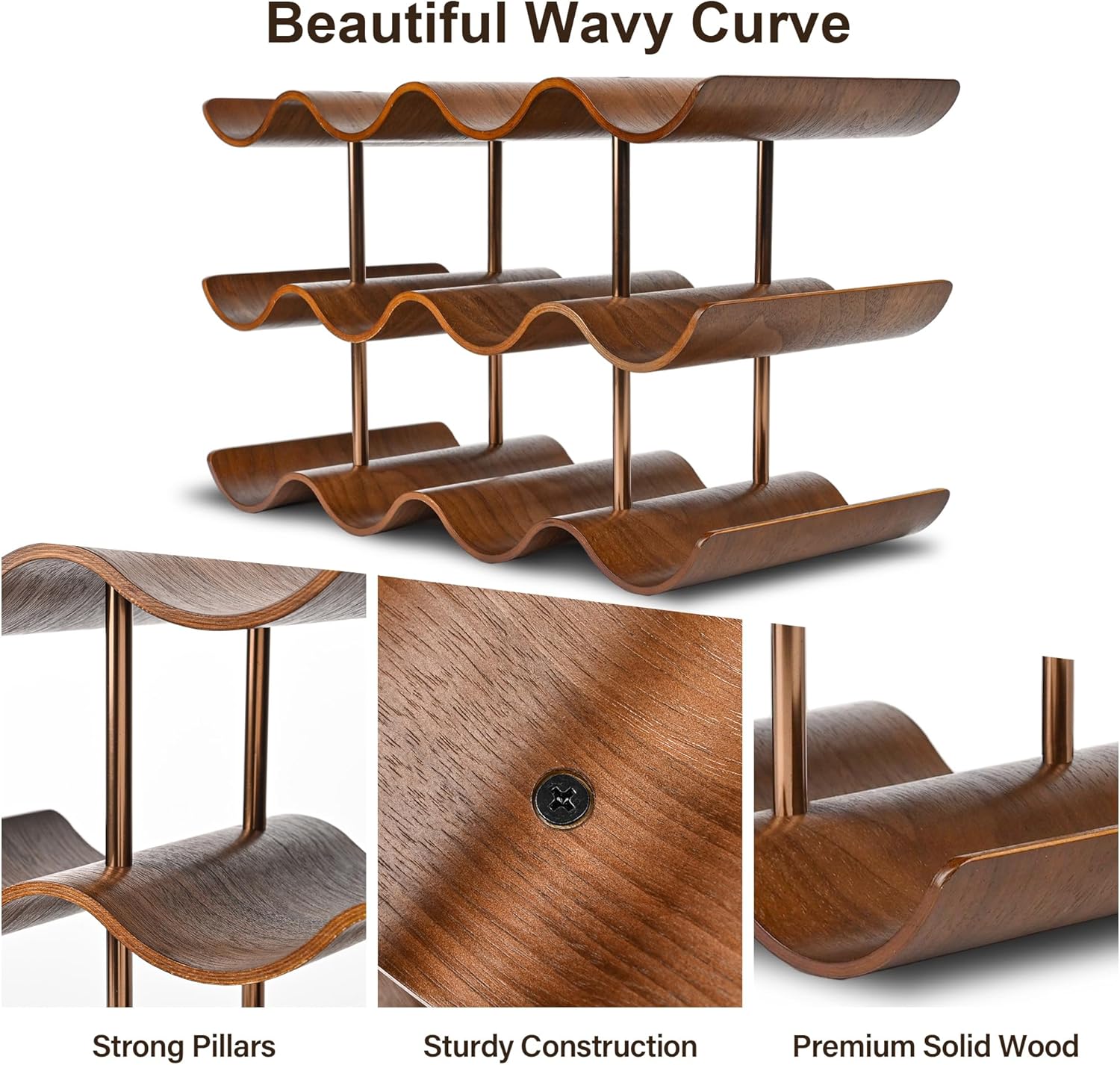 Elegant Styling – The solid wood material is pressed at high temperature to form graceful wavy shape, which is stylish and elegant. This design also keeps the wine securely in the trough, preventing the bottle from rolling, both aesthetic and functional.