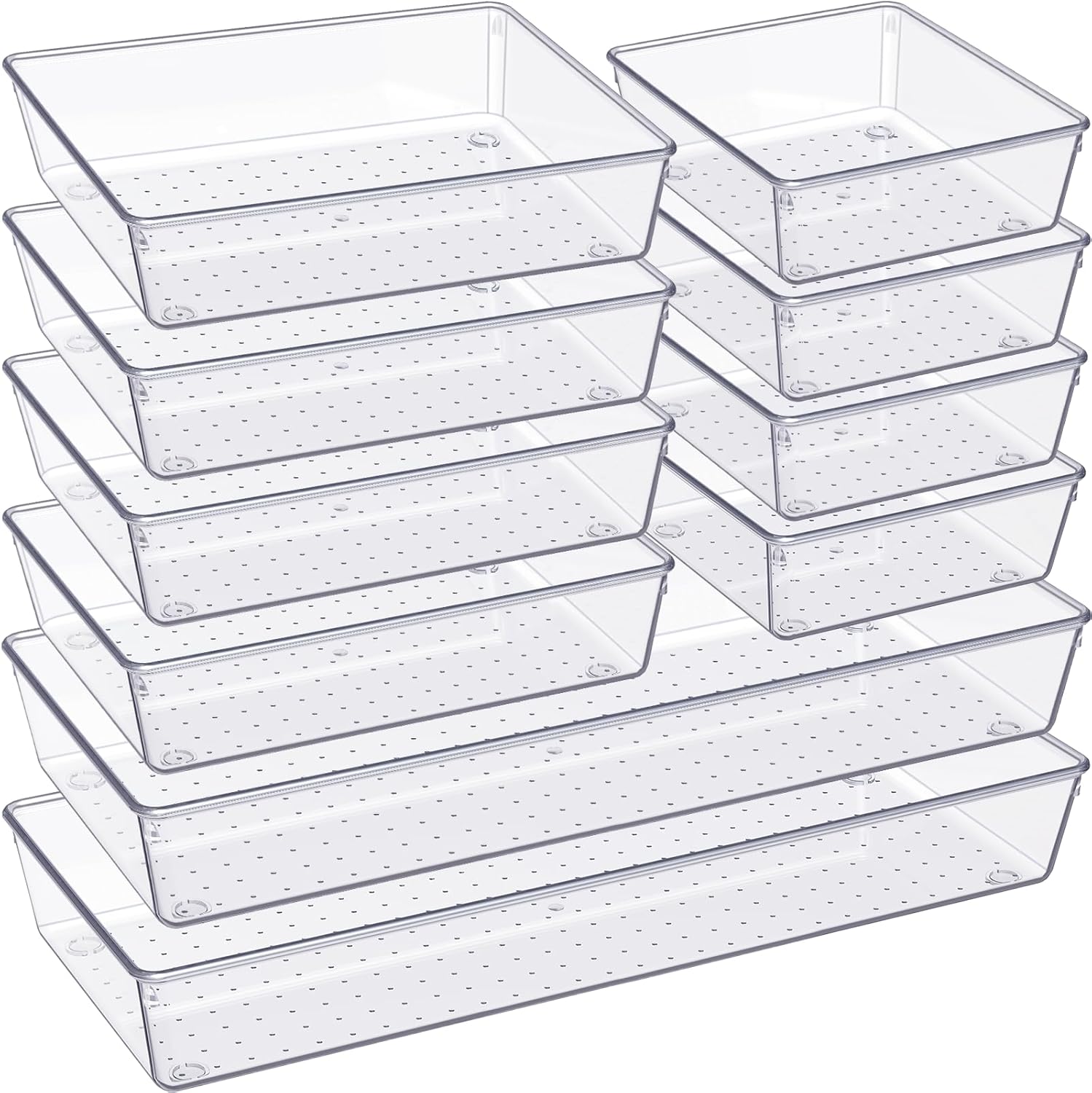 Criusia Drawer Organizer, 10 Pack Large Clear Plastic Set, 3 Size Versatile Bathroom and Vanity Organizer Trays, Storage Bins for Makeup, Bedroom, Kitchen Utensils