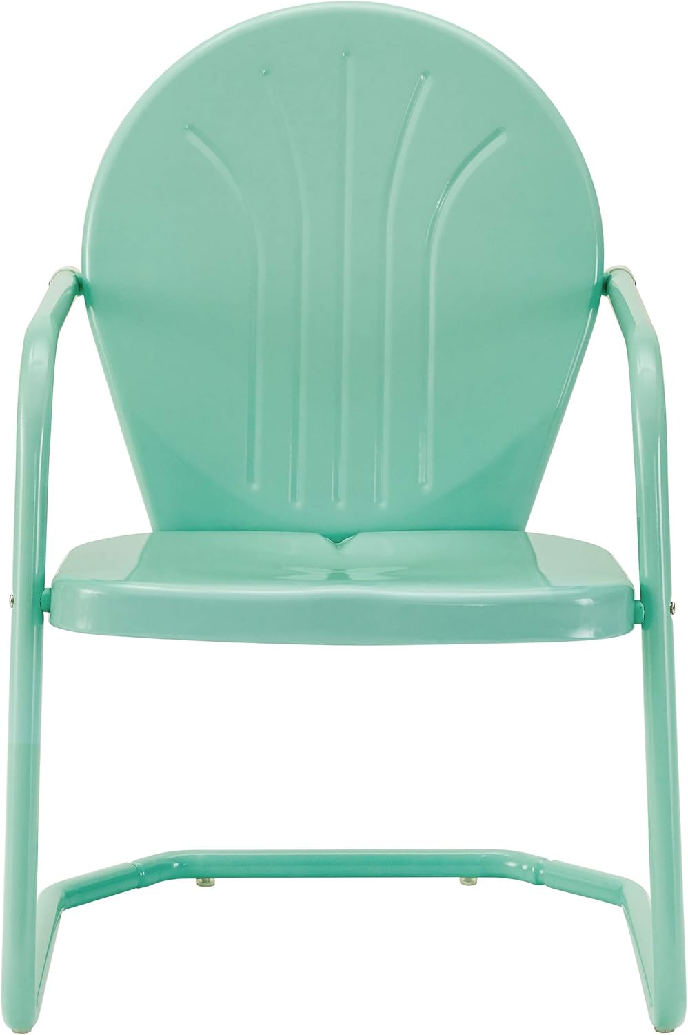 RETRO THROWBACK: This outdoor metal chair brings vintage charm to life with its vibrant aqua gloss finish and round back featuring decorative grooves.