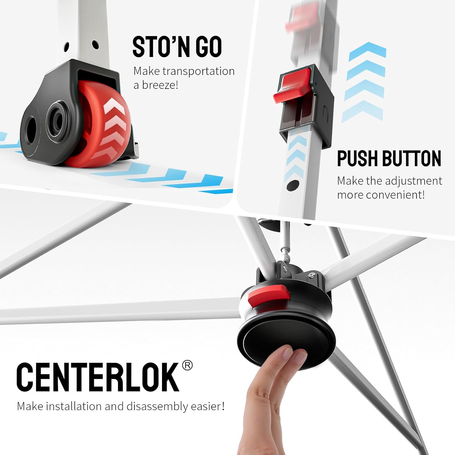 EASIEST SET UP: Patented one push center lock technology – central hub locks out all four legs with a single push. Then use the soft pinch-free buttons to set the leg height. Next generation canopy designed so two people can set it up in seconds with no tools necessary.
