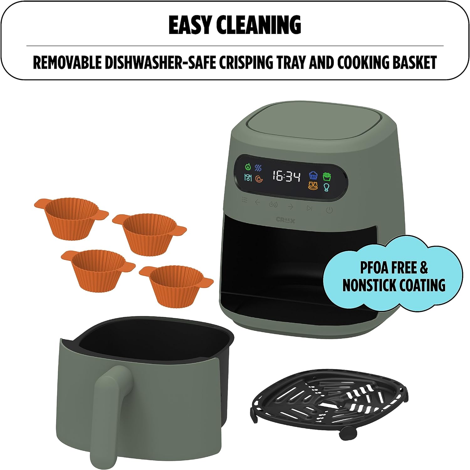 CRUX x Marshmello 3.0 QT Digital Air Fryer with TurboCrisp Technology, Touch Screen Temperature Control, Timer and Auto Shut-off, Fully Programmable, Silicone Cupcake Molds Included, Olive