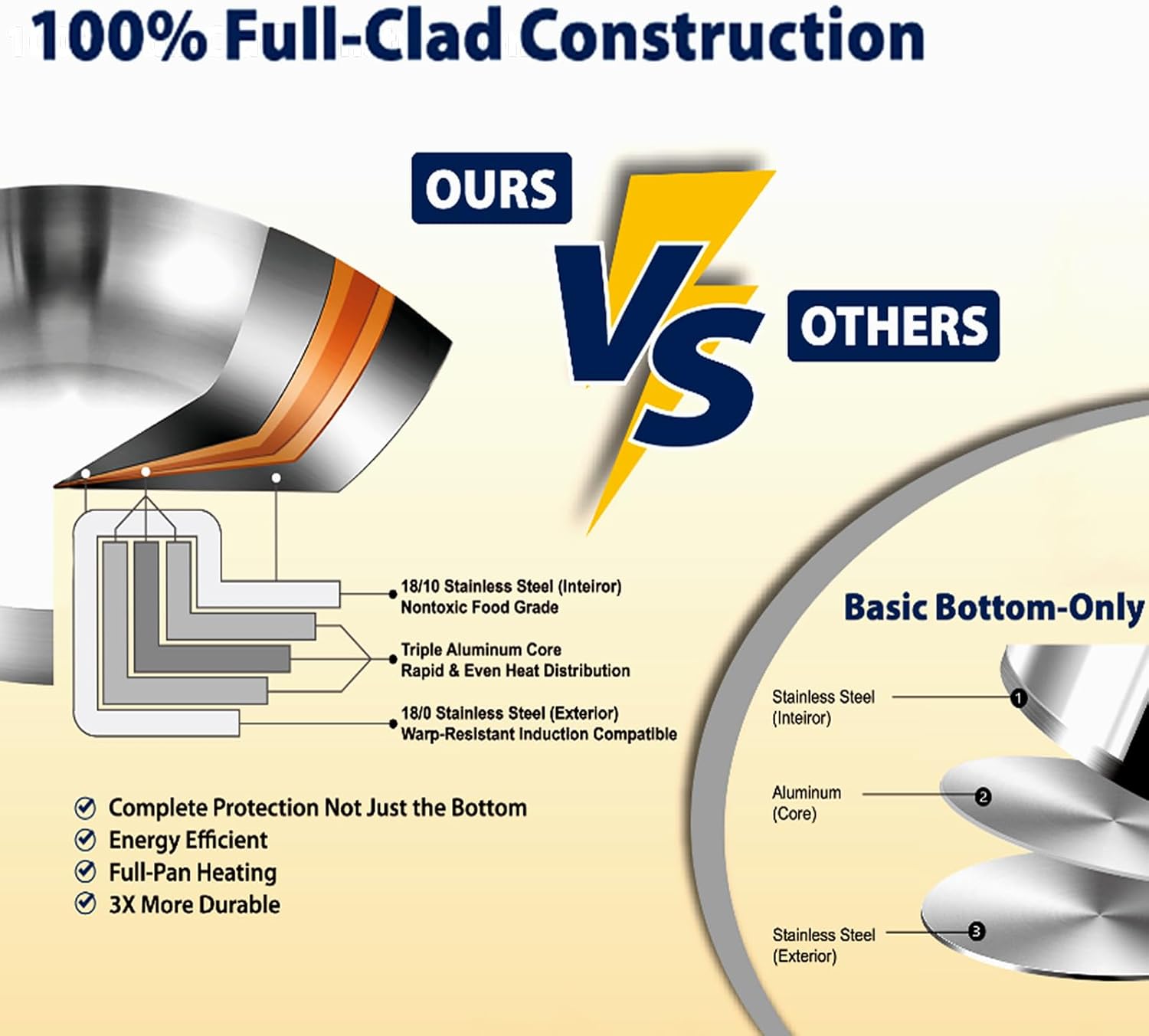 The Delarlo Fully Clad Triply Stainless Steel 8 Quart Pot with Lid Consists of Three Layers Materials. The Inner Layer is 18/10 Stainless Steel, the Middle Layer is Aluminum, and the Outer Layer is 18/0 Stainless Steel. The Substantial 2.3mm Material Makes the 8 QT Pot Not Only Durable and Heavy Duty, But also Enables The Cooking pots Body to Withstand a High Temperature Up to 650℉, and The Lid 300℉