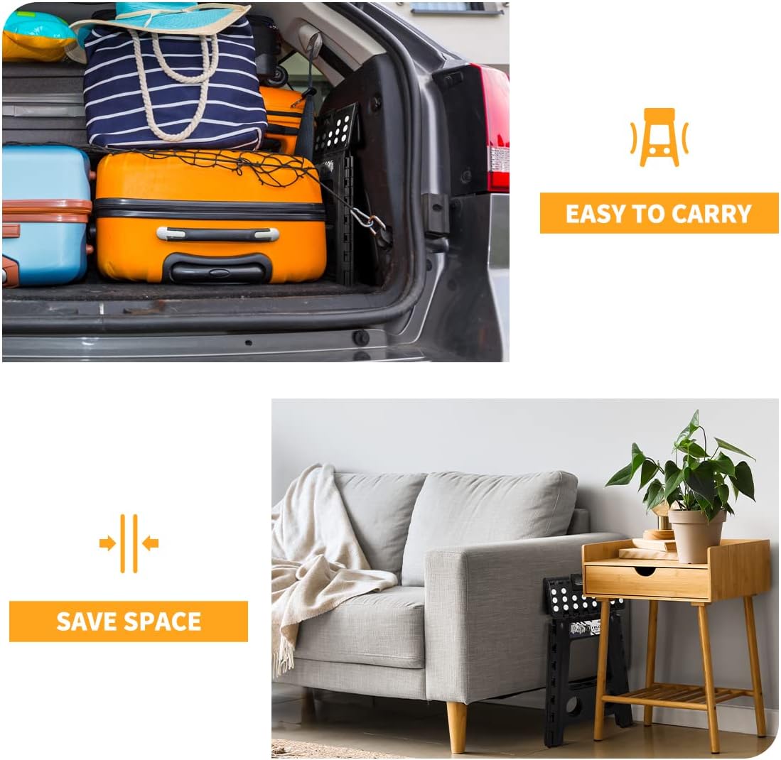 Space-Saving Folding Stool : Our foldable plastic stool is designed to save up to 90% of space when folded. It’s easy to store under the bed, in a closet, or in tight spaces between furniture. Plus, it fits perfectly in your car trunk—ideal for small apartments and road trips