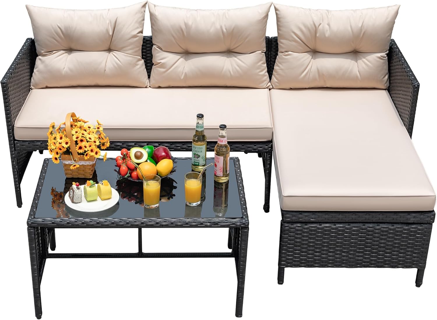 Devoko Outdoor Patio Furniture 3-Piece Rattan Waterproof Outdoor Sectional Sofa All-Weather L Shaped Patio Couch with Cushion Glass Table for Balcony, Garden (Beige)