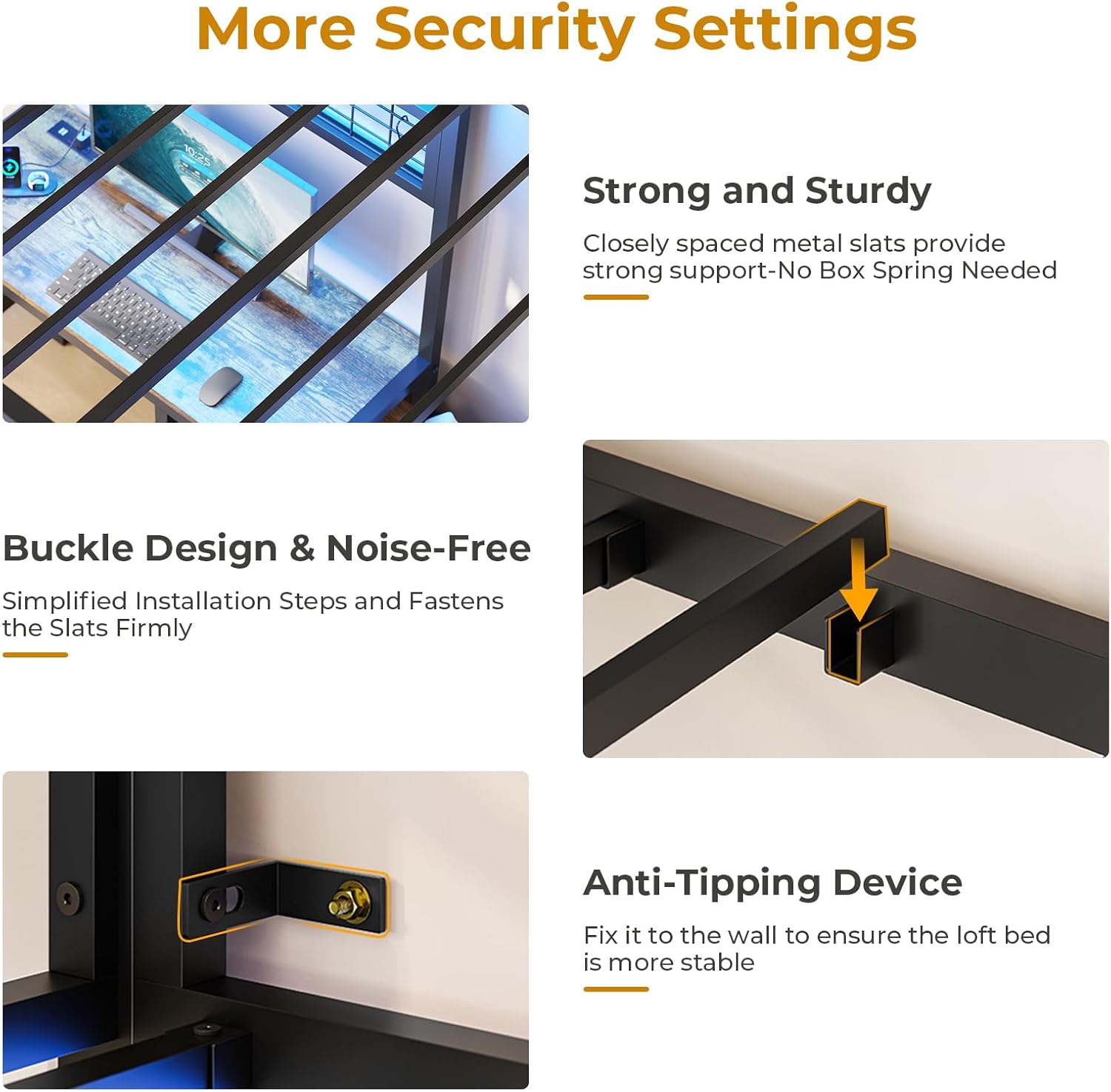 Twin loft bed with secured metal slats-No Box Spring Needed,the ladder attaches to the bed and the top bed includes full-length and raised guardrails to provide safety guaranteed. Anti-tipping device and utilize the heavy-duty screws to tightly fix each part to ensure the bunk bed stability.