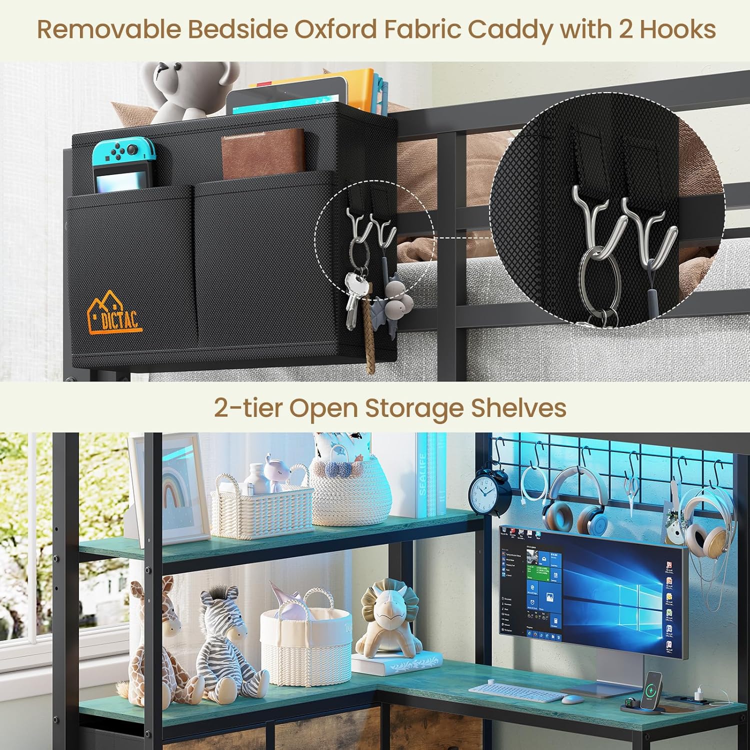 DICTAC twin xl over twin bunk bed adopts L-shaped design,equipped with desk, drawers,charging station,LED light,storage shelves,and DIY metal mesh, making the metal bunk beds a combination of sleeping, leisure, storage and entertainment, max utilization and save space,Ideal choice for limited space.