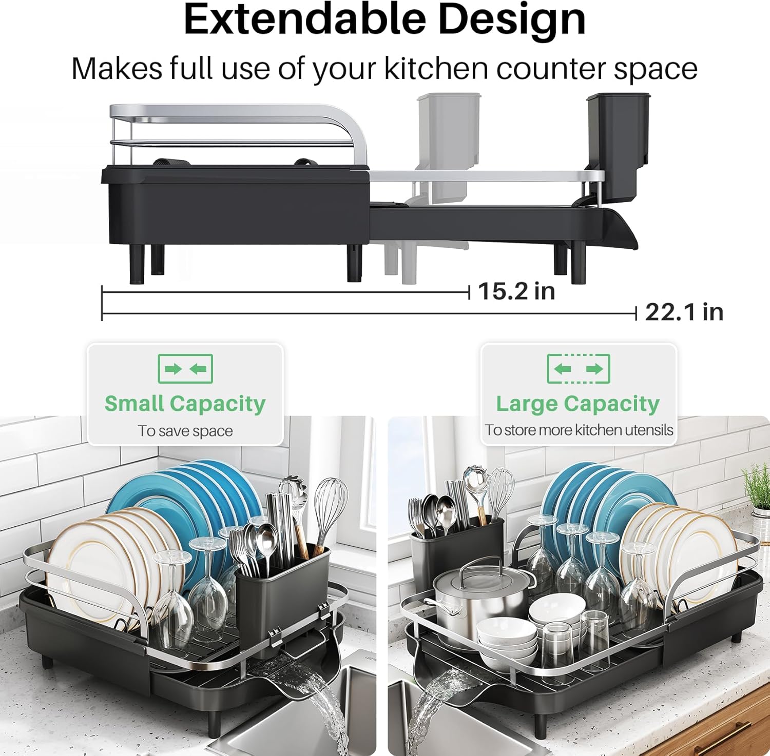 Extendable Design: SNTD’s dish drying rack measures 12.8″ D x 4.7″ H, and the width can be adjusted from 15.2″ to 22.1″, which is suitable for kitchens with limited space. The rack can be extended or retracted to fit your available counter, while it is capable of accommodating 10 plates, 6 bowls and glasses.