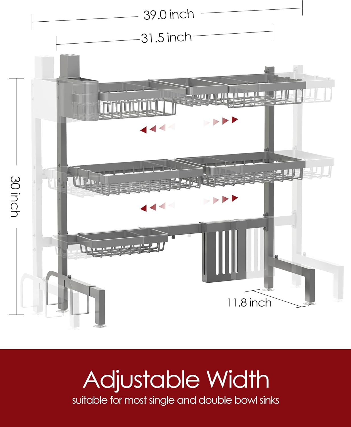 ADJUSTABLE DESIGN: Designed with an adjustable width ranging from 31.5″ to 39.4″, this over-the-sink dish drying rack easily fits a wide range of kitchen sinks. Its flexible sizing ensures a secure fit without sacrificing stability. For the best fit, make sure your sink is less than 39.4″ wide and the faucet is under 21″ high.