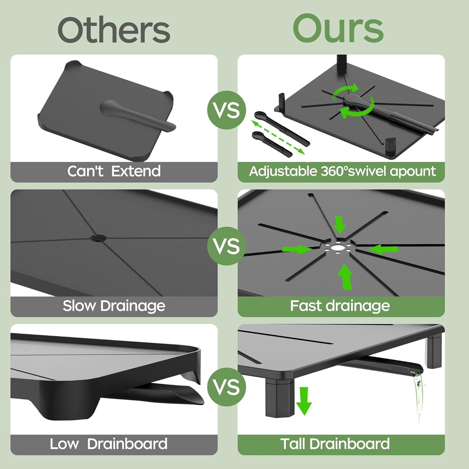 Fast Auto Drainage System: This dish drying rack with drainboard is designed with a removable drainboard which includes central drainage holes and a drainage channel, making sure the water flows directly into the sink rather than into the countertop. The swivel spout rotates 360° which is perfect for adjusting the placement of the dish drainers for kitchen counter to more freely as per the location of the sink.