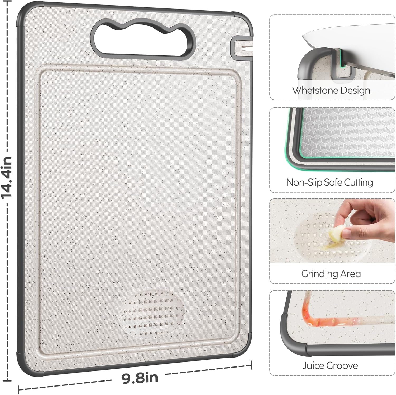 [Thoughtful Design]:This cutting board is equipped with a non-slip silicone edge, which can stabilize the cutting board during cutting to prevent sliding and reduce the risk of hand injuries. The juice groove design can effectively collect the liquid flowing out when cutting, prevent the liquid from splashing on the kitchen countertop, and keep the working area clean and tidy. Additionally, the straw side features a built-in grinding area to make handling ingredients easier.