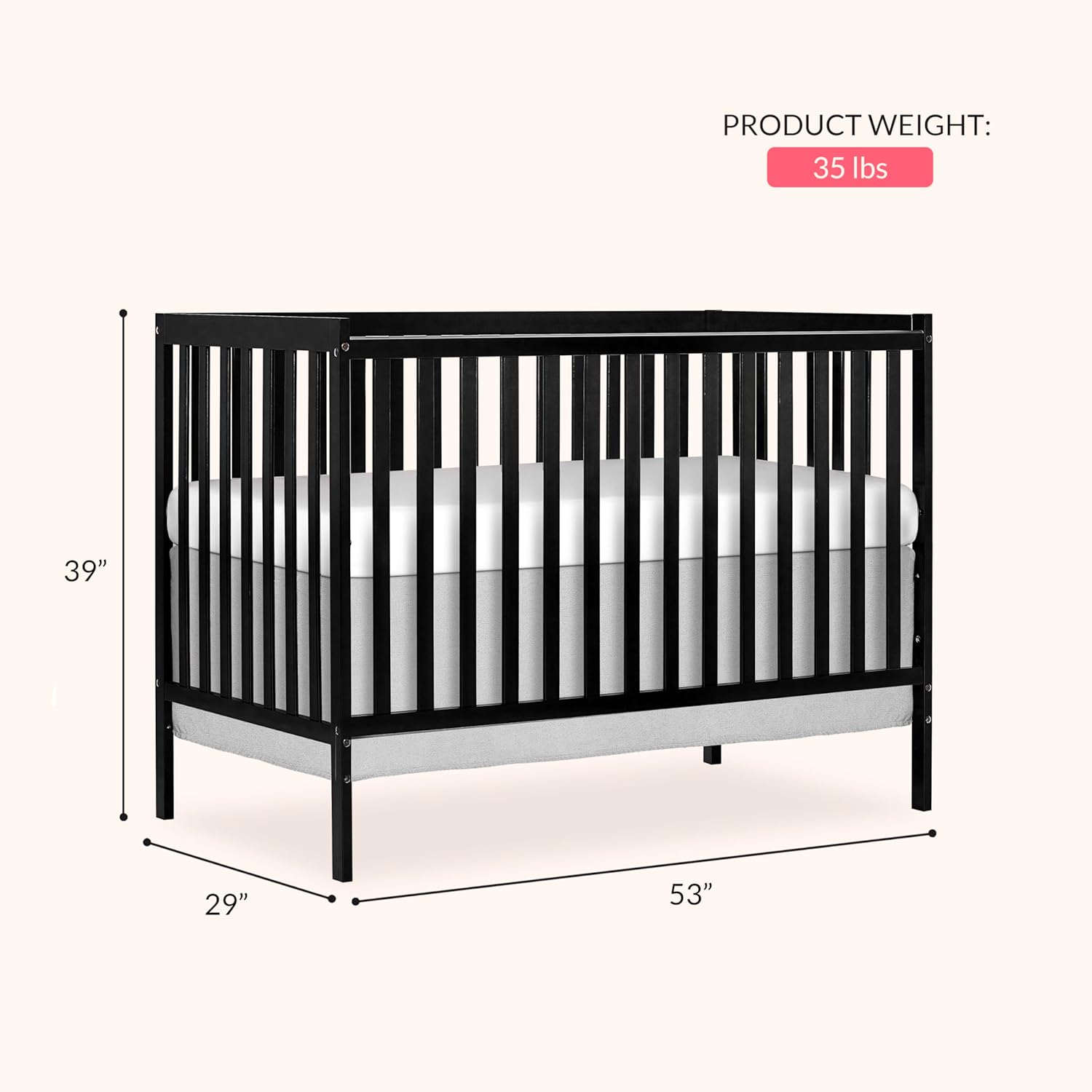 The Dream On Me Synergy 5-in-1 Convertible Crib is the perfect blend of style and substance, bringing together contemporary design with abundant features and a focus on safety. This gender-neutral crib grows with your child! It converts from a crib to toddler bed, toddler bed rail sold separately) a daybed and full-size bed (full-size bed frame and mattress not included). It also comes with a 3-position adjustable mattress support system. Safety and durability are never a concern with the Synergy Convertible Crib. It is built to last, made out of solid reclaimed New Zealand pinewood. All Dream On Me cribs is JPMA certified and meet all applicable ASTM and CPSC standards. All of our products are tested by third-party labs for lead and other toxic elements to meet or exceed CPSC and ASTM safety standards. The Synergy comes in beautiful finishes that allow you to create the nursery of your dreams – contemporary, whimsical, fairy, vintage – let your imagination reign supreme! This is a standard full-size crib and measures 53.0″ L x 29.0″ W x 39.0″ H inches. For the best fit, we recommend any Dream On Me or Evolur full-size, non-toxic, Greenguard certified mattress.