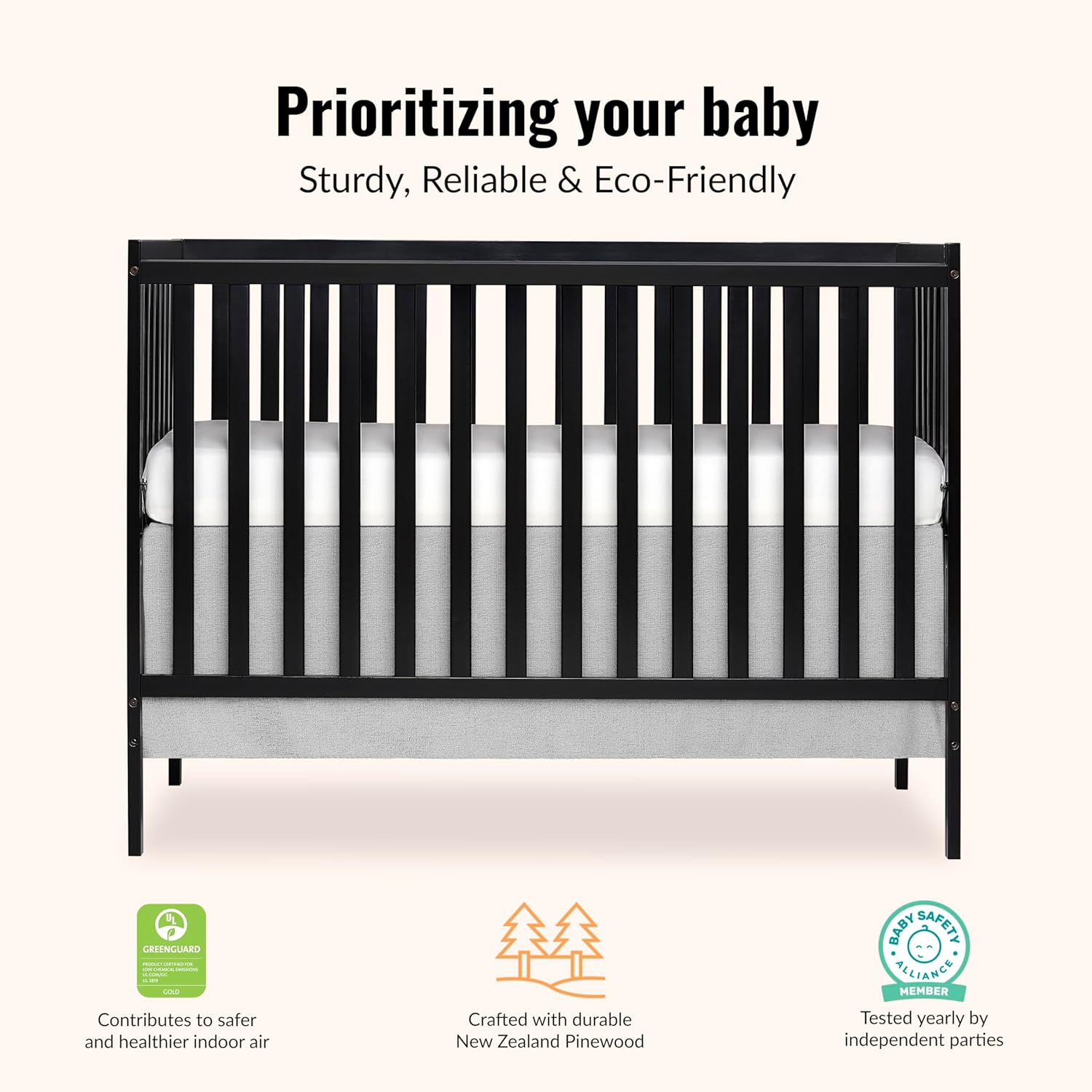 SAFETY FIRST ALWAYS – This crib is JPMA Certified to meet or exceed all safety standards set by the CPSC & ASTM; All of our products are tested by 3rd party labs for lead and other toxic elements to meet or exceed CPSC and ASTM safety standards