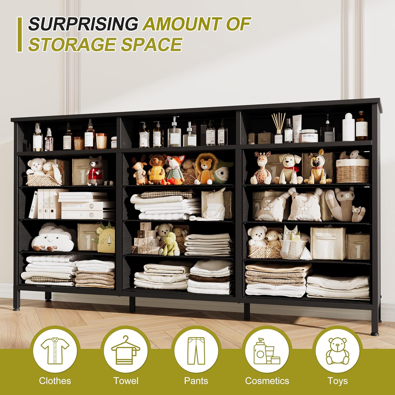Can be used as a TV Stand- The drawer dresser measures 59″ (L) x 11.8″ (W) x 35.5″ (H). 12 long fabric drawers measure 18.3″L x 11.8″W x 5.9″H, with each supporting up to 10lbs. The dresser’s wood top can hold 200lbs, making it suitable as a TV stand, perfect for TVs up to 65 inches