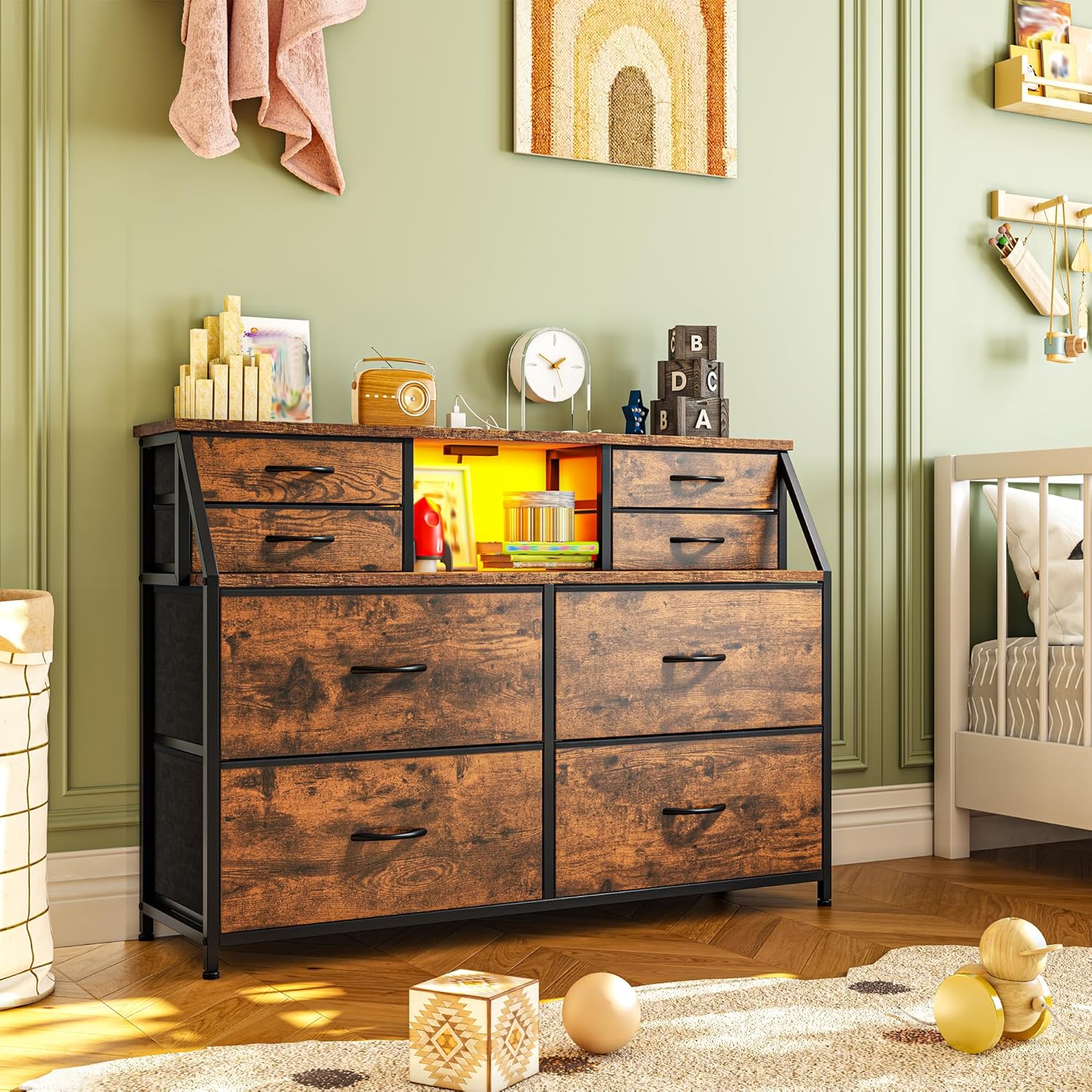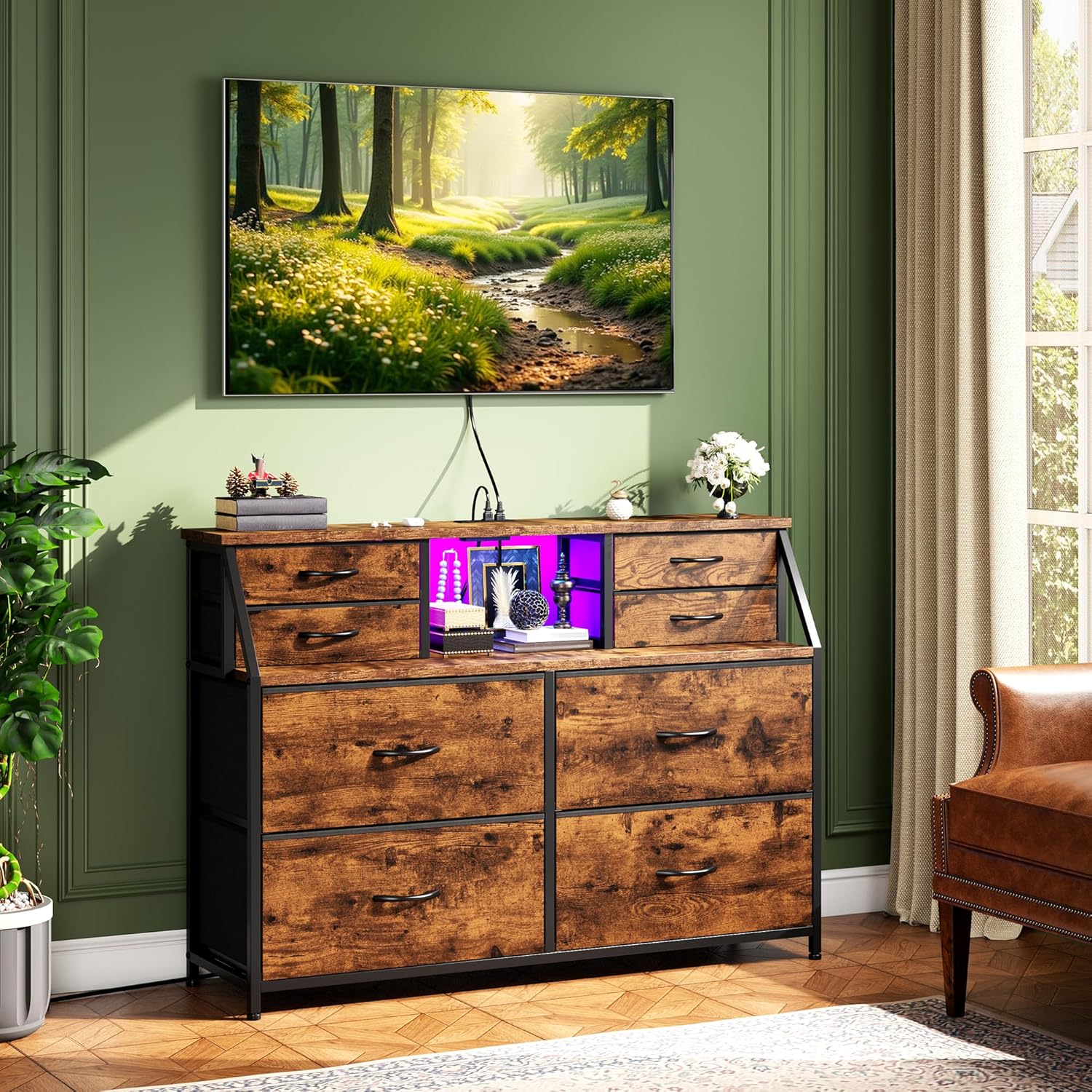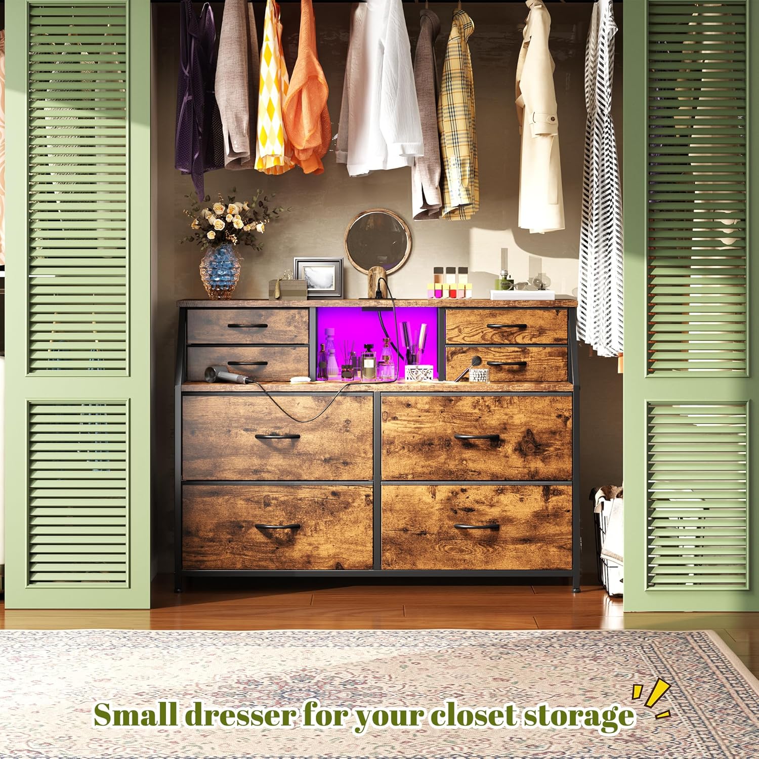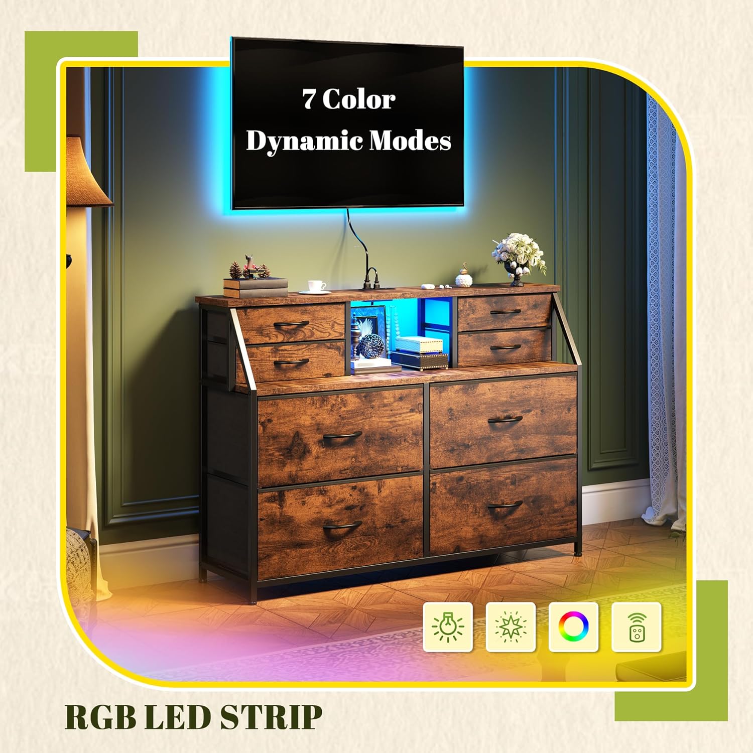 【Built-in Charging Station & LED Lights】This samll dresser includes a power strip (2 AC outlets & 2 ports) and customizable LED lighting (7 dynamic color modes and 7 static color modes). Stay connected with the integrated USB hub (compatible with phones, tablets, and smart devices)—ideal for bedrooms, living rooms, or entryways. The chests of drawers included remote control lets you easily adjust lighting to set the perfect mood