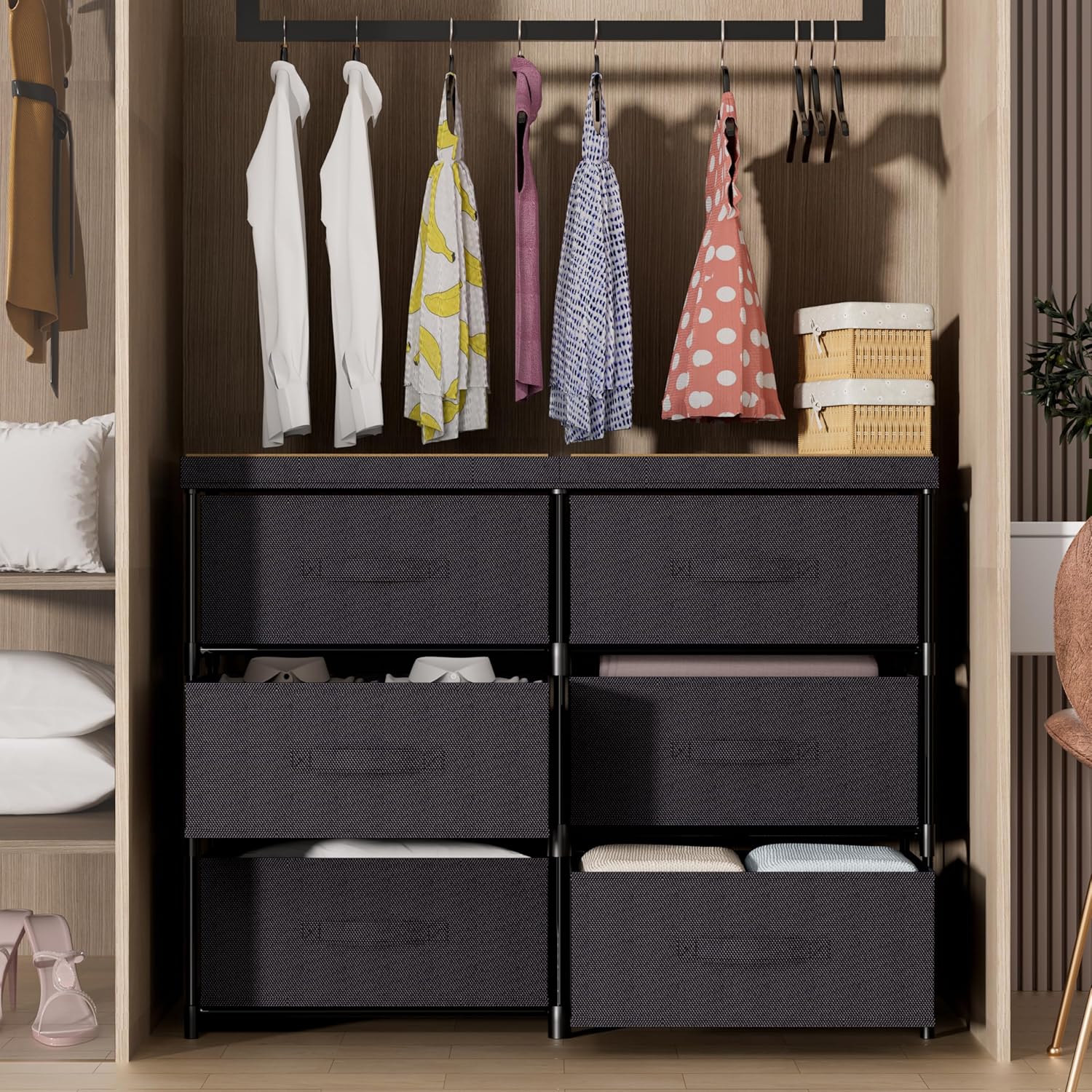 High-Quality Metal Construction: This fabric dresser is crafted with durable iron, ensuring stability and a long lifespan. The top wooden shelf offers excellent load-bearing capacity, accommodating various items with ease.