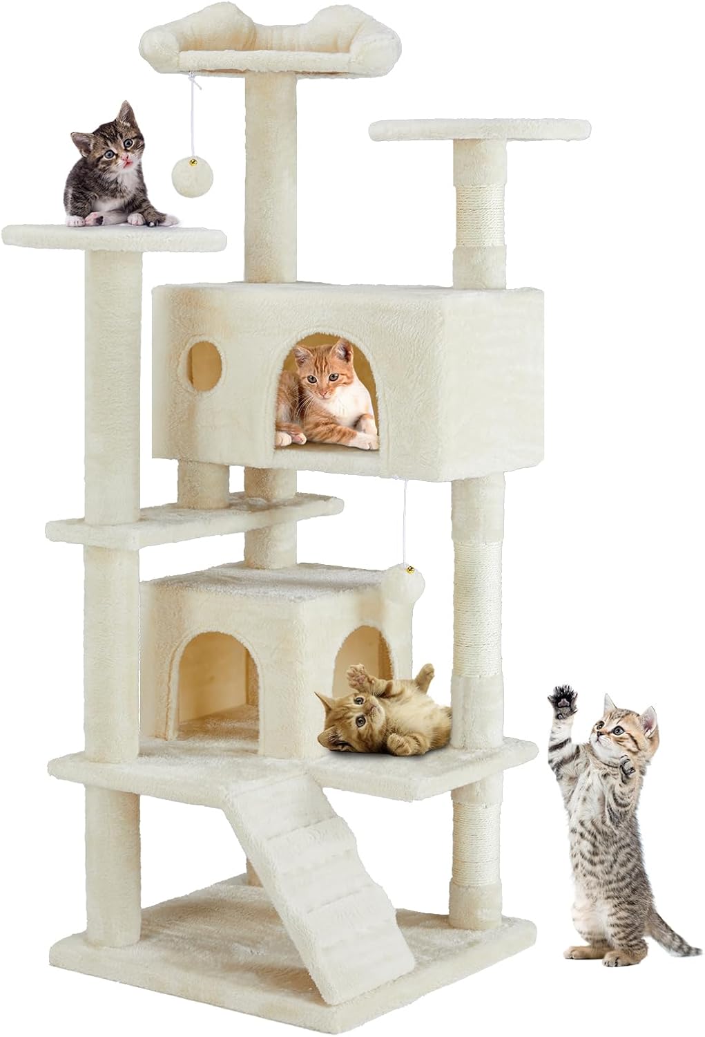 DUMOS 54-inch Indoor Cat Tree Tower –Multi-Level Pet House for Large Cats with 2 Condos, Scratching Posts, Round Platform, Small Ladder, and Toys, Beige