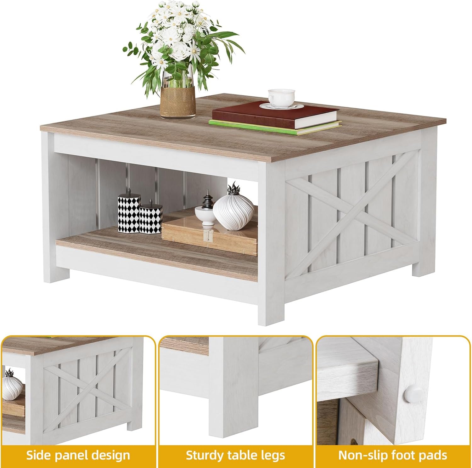 Durable Materials: Made from sturdy materials, farmhouse coffee table is built to last. The sturdy wood construction ensures it can withstand everyday use and the occasional spill or mishap