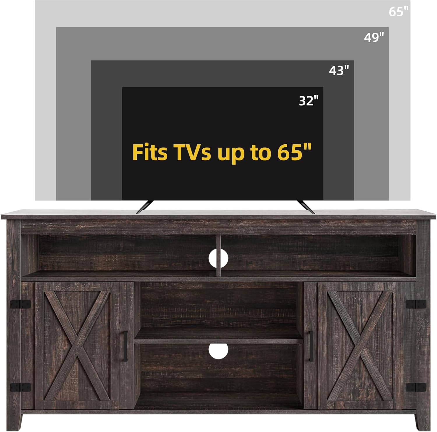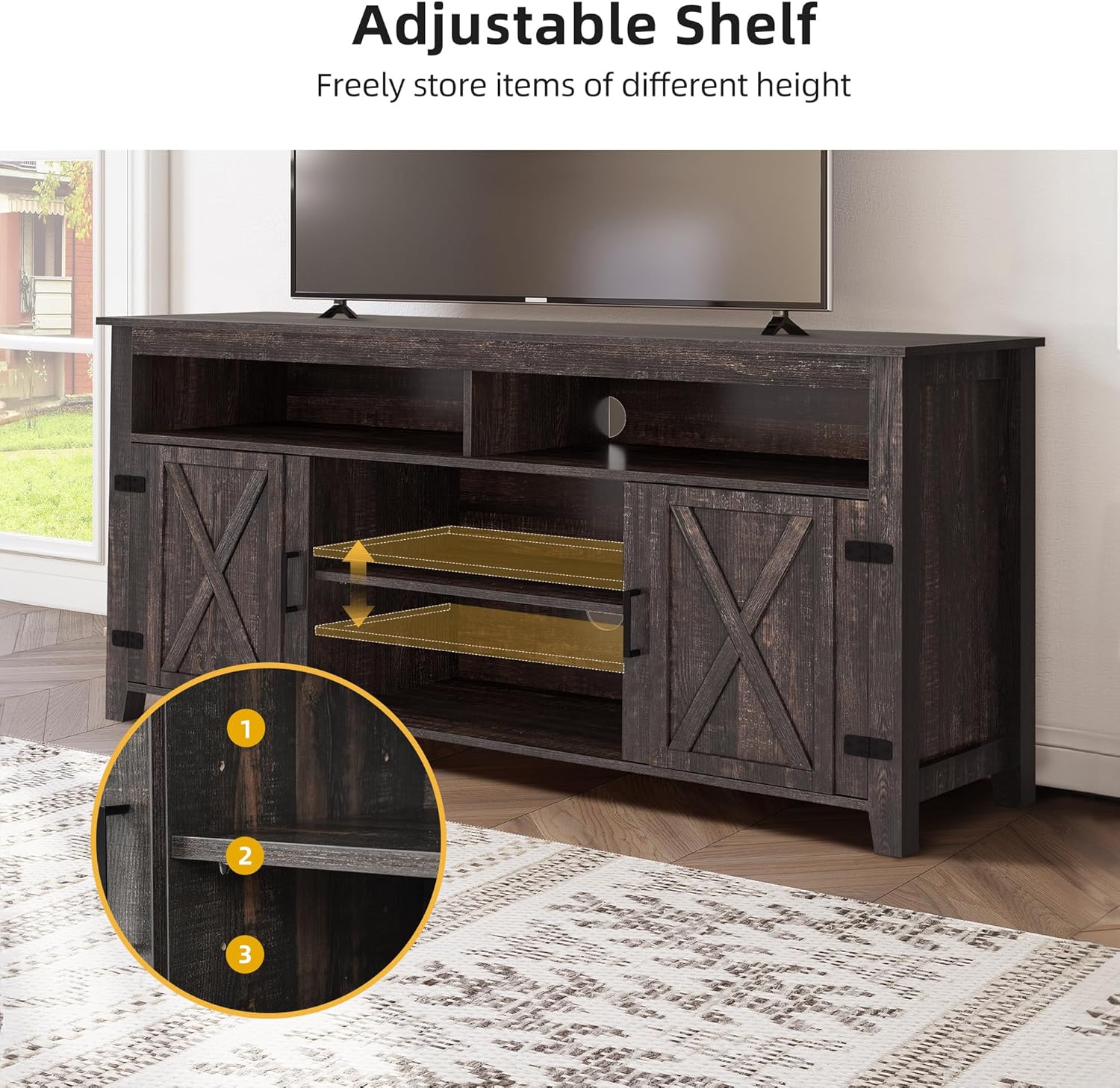 TV Stand with Storage: This tv stands for living room come with 2 cabinets of storage space inside the barn doors, 1 adjustable or removable shelf, 1 open storage shelf, and one 59 inch large spacious desktop. It providing abundant storage or display space for CDs, DVDs, game boxes, decorative items and more. The spacious tabletop supports 40, 45, 50, 55, 60, or 65 inch TV