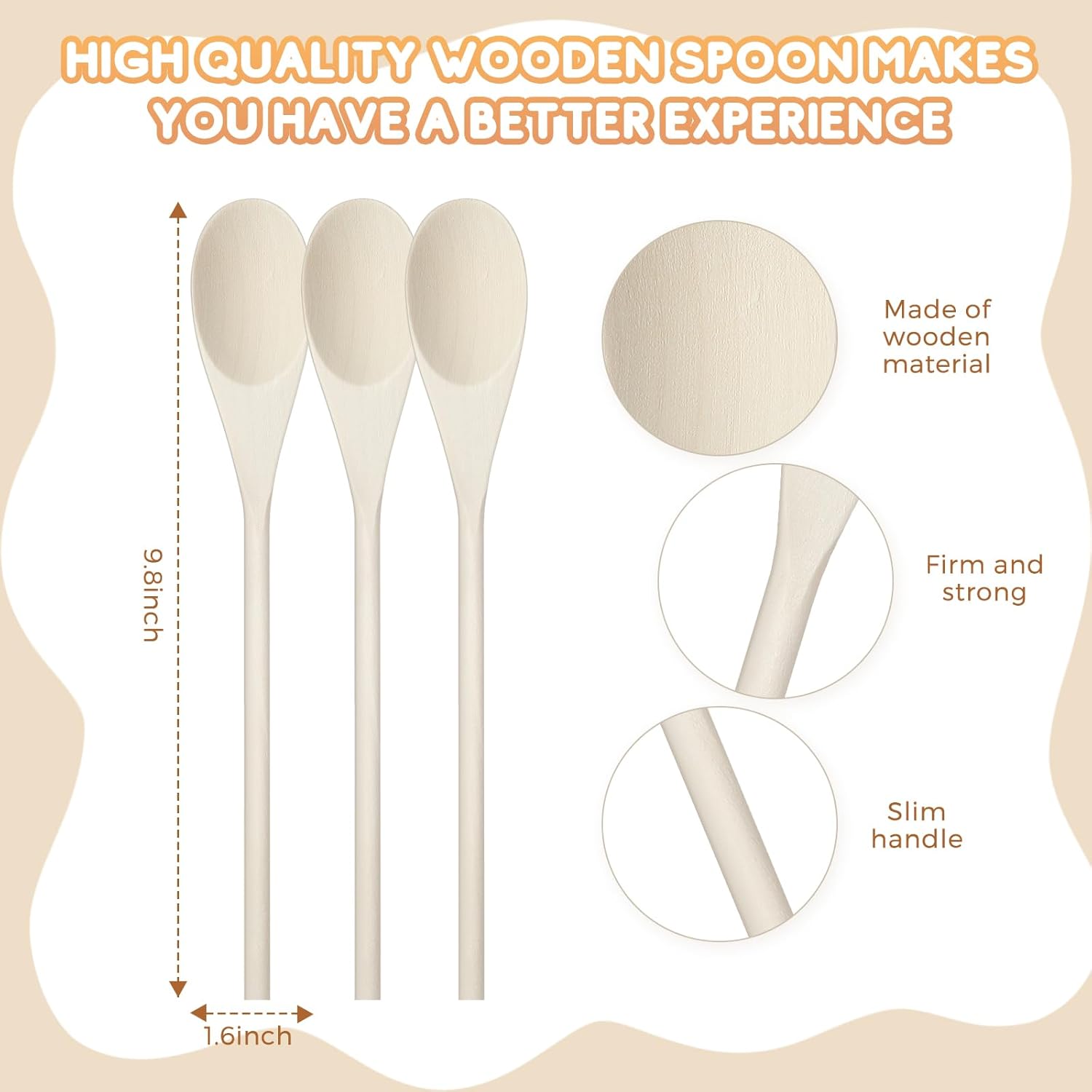 Nice Size to Hold: our wooden cooking spoons are approximately 9.8 inches long, and the appropriate length allows us to grip comfortably; The width of the spoon heads are approximately 1.57 inches, which can hold enough food