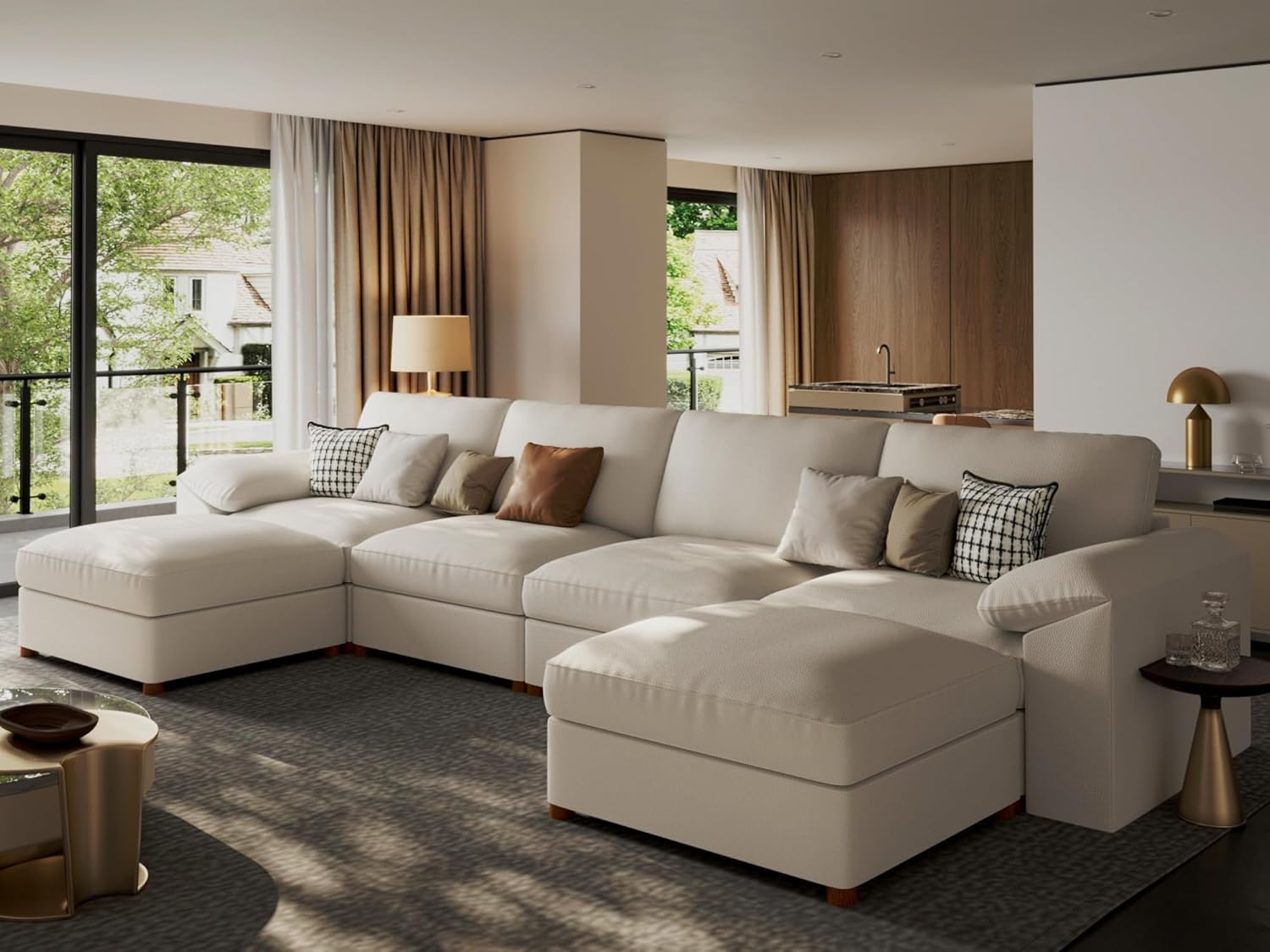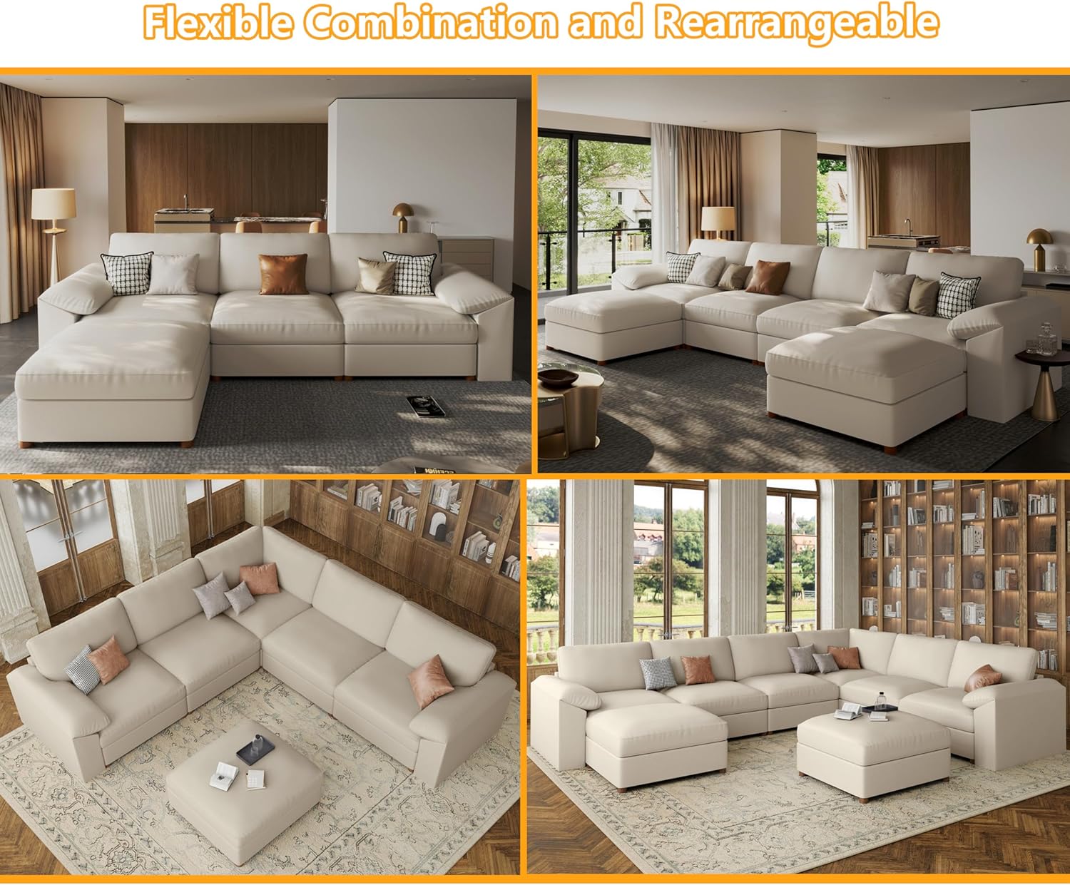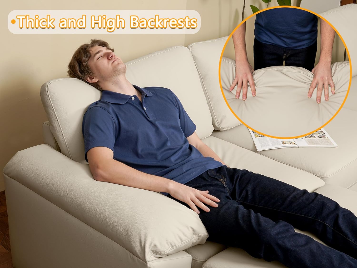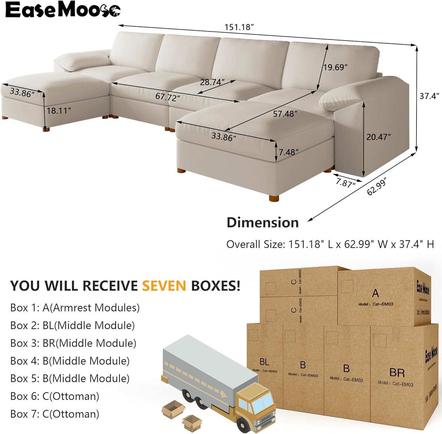 Oversized Deep Seat Sectional Sofa: Each individual seat size: 33.86 inches wide x 34.25 inches deep x 37.4 inches high, far exceeding most sofas. The backrest height is increased from the common 16.5 inches to 19.7 inches,which can more comfortably support your back and neck.The EASE MOOSE oversized Modular couch has added a larger faux leather couch and upgraded multiple functions, which will bring you a brand new sitting experience.