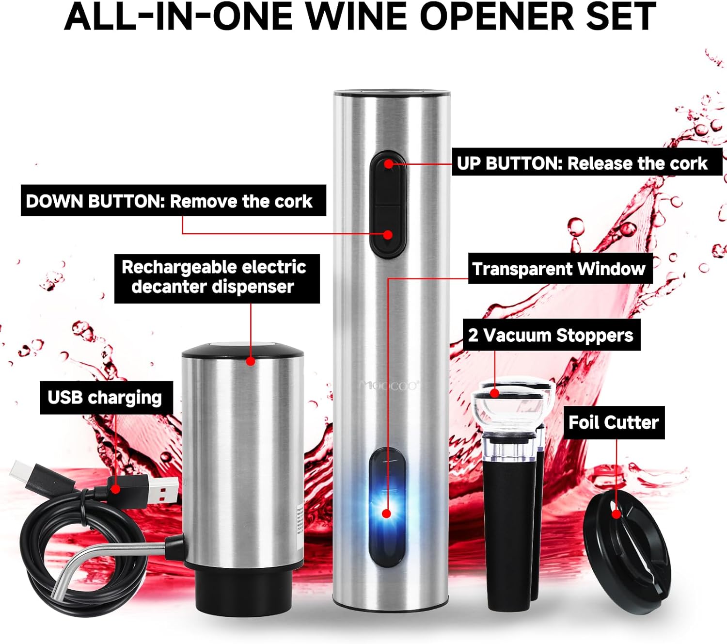 2024 upgraded Moocoo electric wine opener set contains amost all you need, gives you a fabulous wine drinking experience.