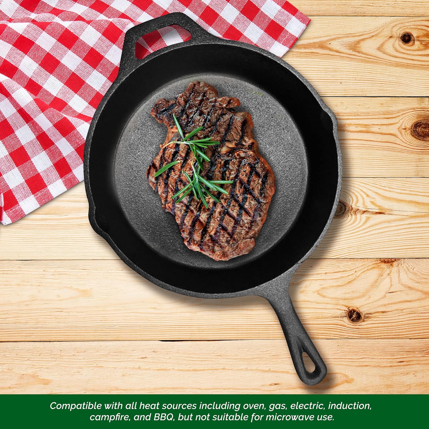 COMPATIBLE WITH ALL STOVETOPS: The iron construction of these skillets makes them compatible with all types of stovetops, including induction, gas, electric, and ceramic, offering unmatched versatility for any kitchen setup.