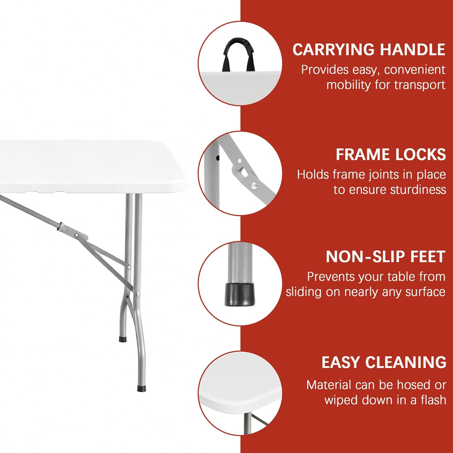 Heavy Duty Folding Table: Constructed with heavy-duty steel legs and a polyethylene plastic table top, this foldable table supports heavy loads for reliable and long-lasting use in a variety of conditions. Use it as a camping table for rugged terrain or as a spacious picnic table for family gatherings