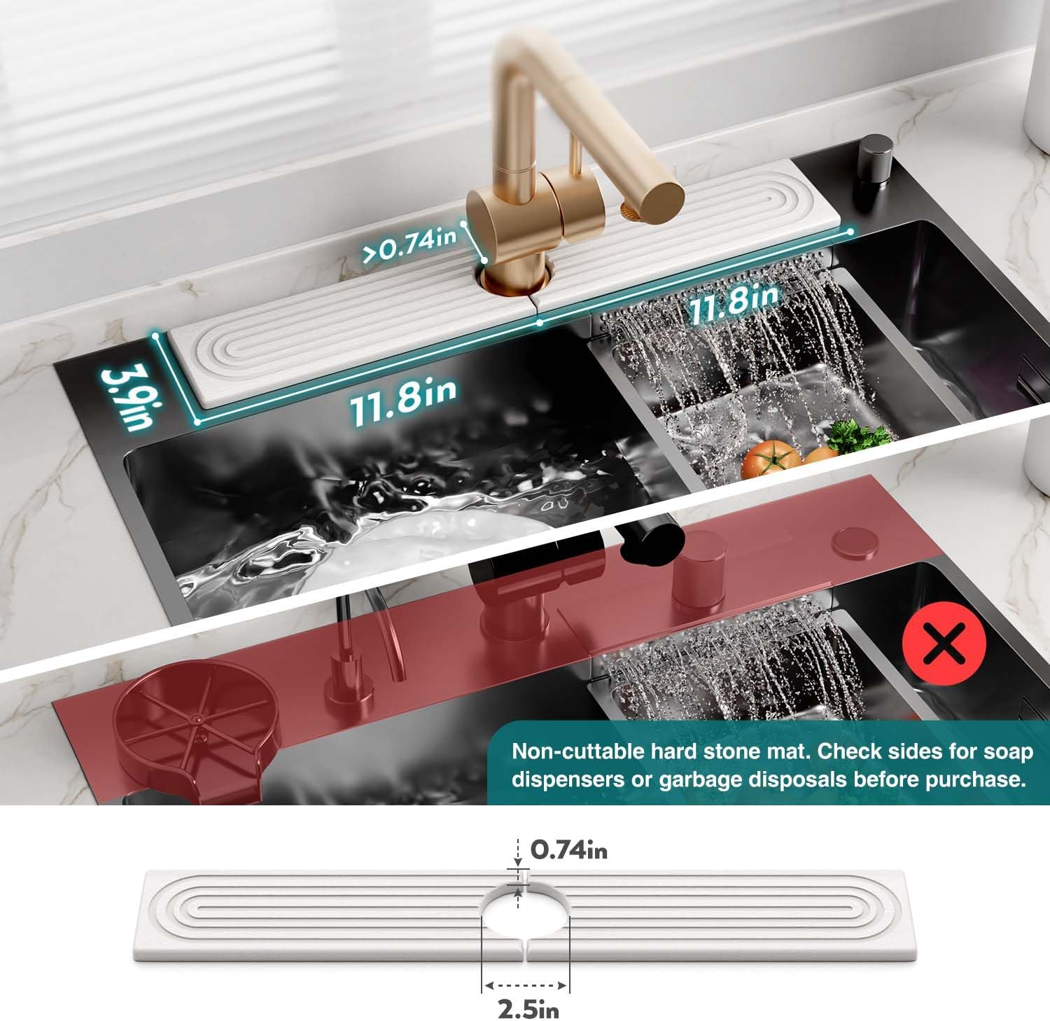 𝐁𝐞𝐟𝐨𝐫𝐞 𝐩𝐮𝐫𝐜𝐡𝐚𝐬𝐢𝐧𝐠: ➊ Based on the product size, make sure the stone won’t cover any sink buttons or dispensers. ➋ Faucet-to-wall distance must be over 0.72″. ➌ Faucet base diameter must be under 2.5″. | Size: 23.6″ x 3.9″ x 0.4″, with a 2.5″ center hole. NON-CUTTABLE HARD STONE MAT.