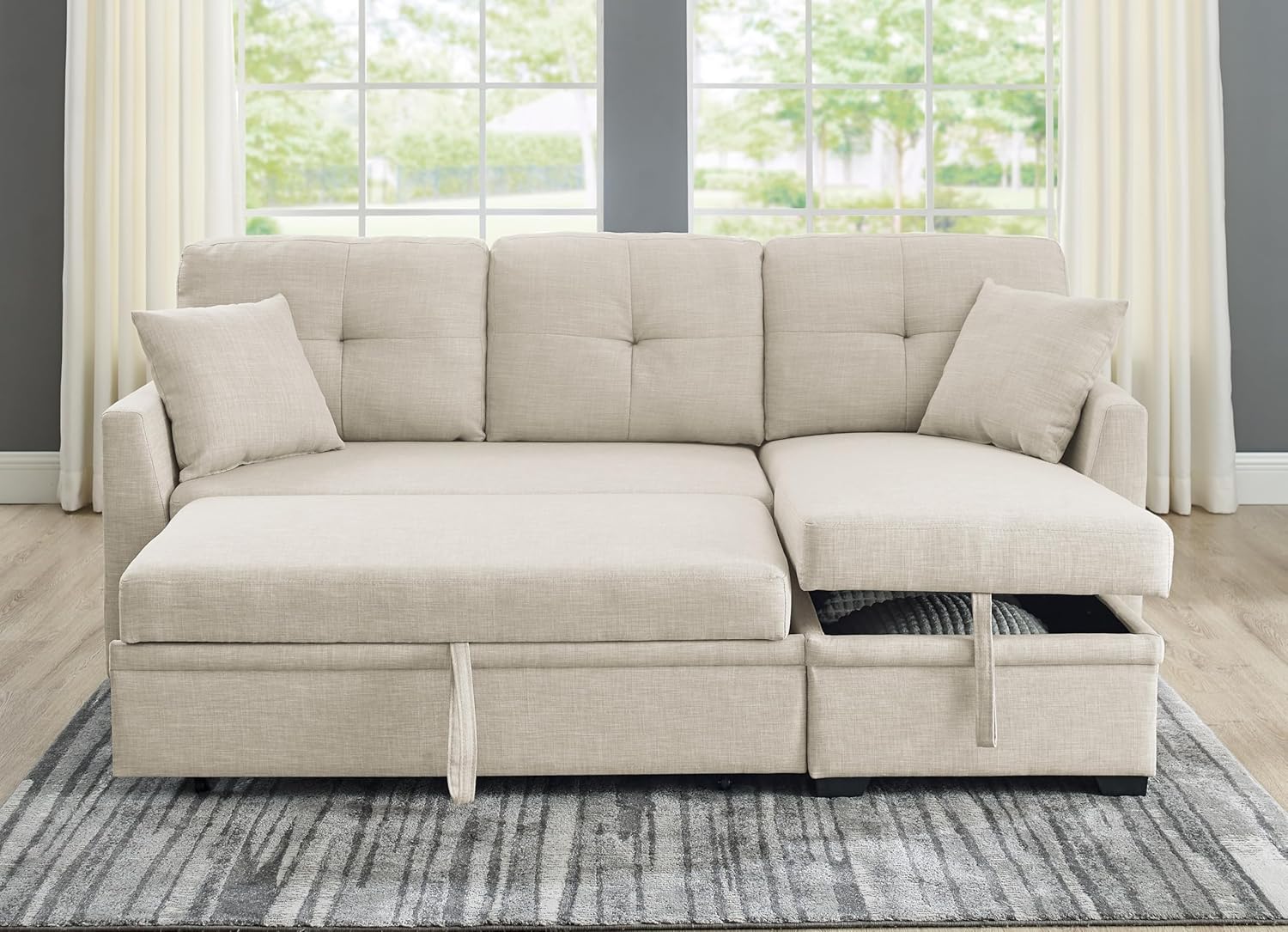 【Tufted Upholstered 】Decorated with soft fabric, this sofa features fluffy, tufted backrest pillows and seat cushions for all-day lounge. Designed as versatile, this section can be easily converted into a spacious sleeper, ideal for nighttime guests.