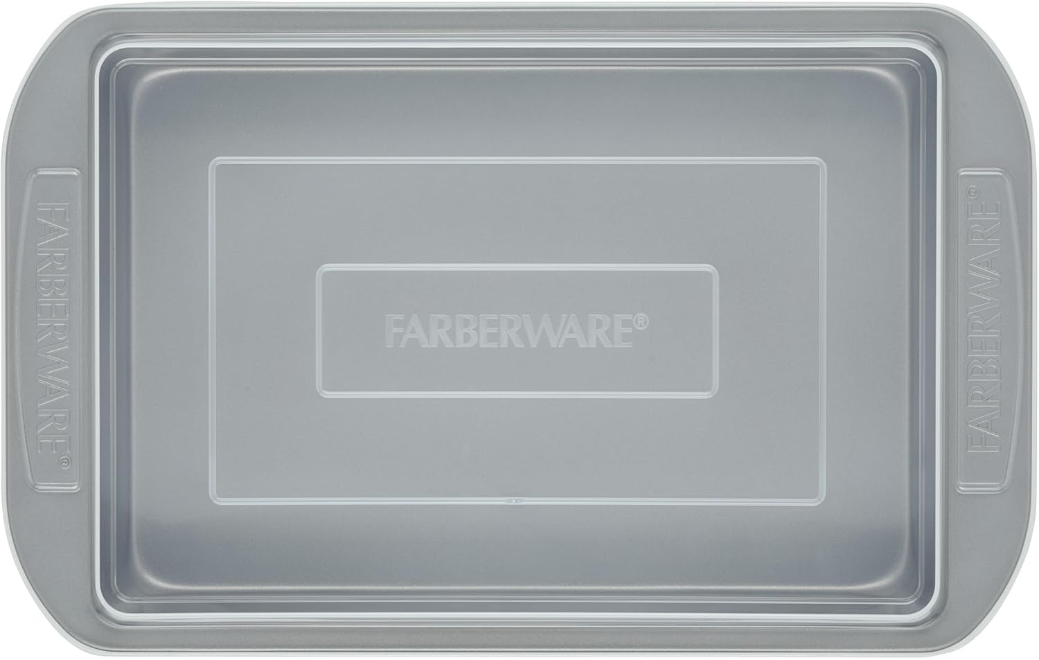 Transporting baked goods is easier than ever with the Farberware Nonstick Bakeware 9-Inch x 13-Inch Rectangular Cake Pan with Lid. Featuring heavy-duty construction, the durable nonstick baking pan with lid reliably resists warping and heats evenly to brown beautifully and help reduce hot spots that can burn baked goods. The convenient and sturdy plastic lid makes it easy to take a birthday cake to a family party, or lasagna to a neighbor’s house, while preserving both appearance and freshness (lid not intended for oven use). This cake pan’s nonstick inside and out – thoughtfully designed and responsibly made without PFAS, PFOA, lead, or cadmium* – delivers great food release with quick cleanup. Oven safe to 450 degrees F, this nonstick cake pan makes an ideal addition to mini muffin, loaf and other baking pans in the Farberware Bakeware collection. *Product design does not involve intentionally adding to the interior nonstick coating any of these substances which may otherwise be present in the environment.