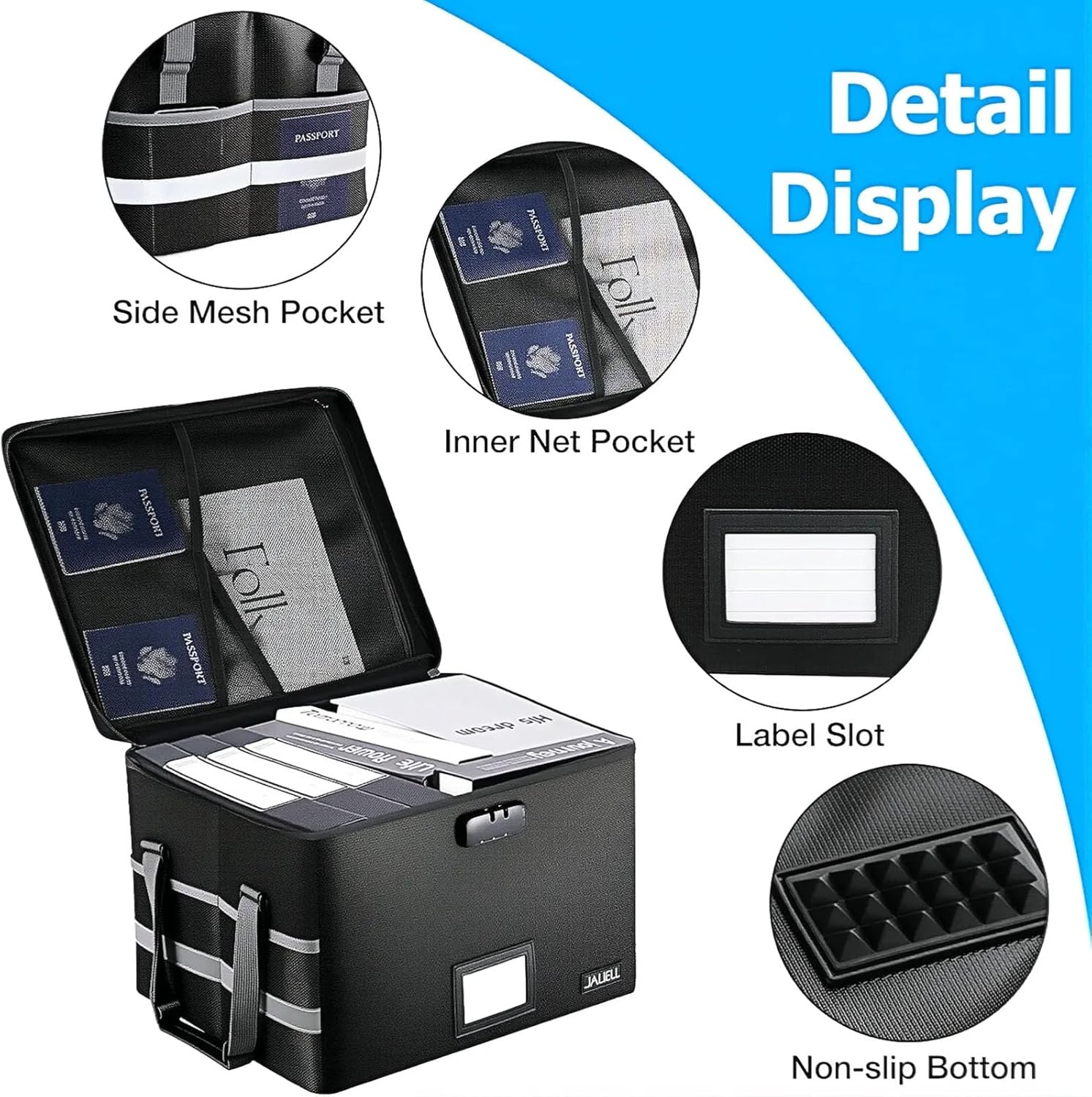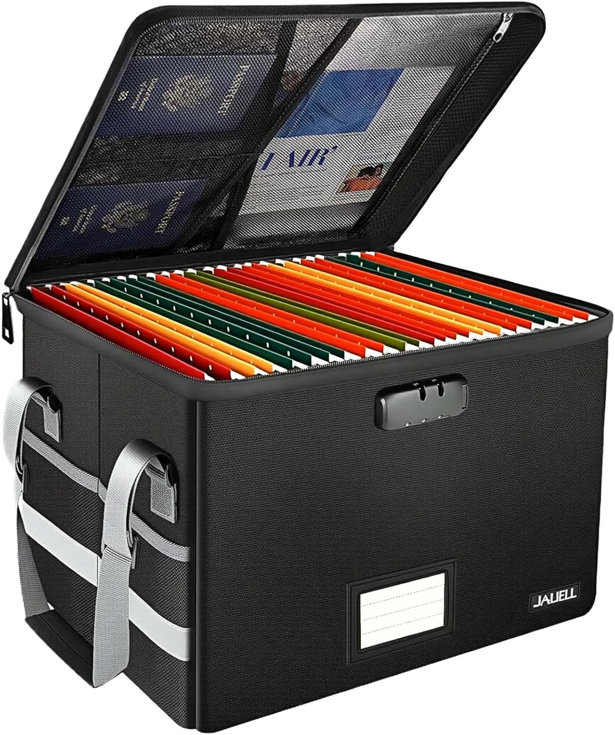 Large Capacity Locking File Box: 15.55″ x 12″ x 10.43″. This fireproof file cabinet fits both letter and legal size files to match your filing system. Beyond documents, it protects your valuables—from books, CDs, DVDs, albums, and USBs to passports, social security cards, and birth certificates. With 1 large pocket and 4 mesh bags inside the lid, plus 4 outer pockets on the sides, everything stays organized and secure.