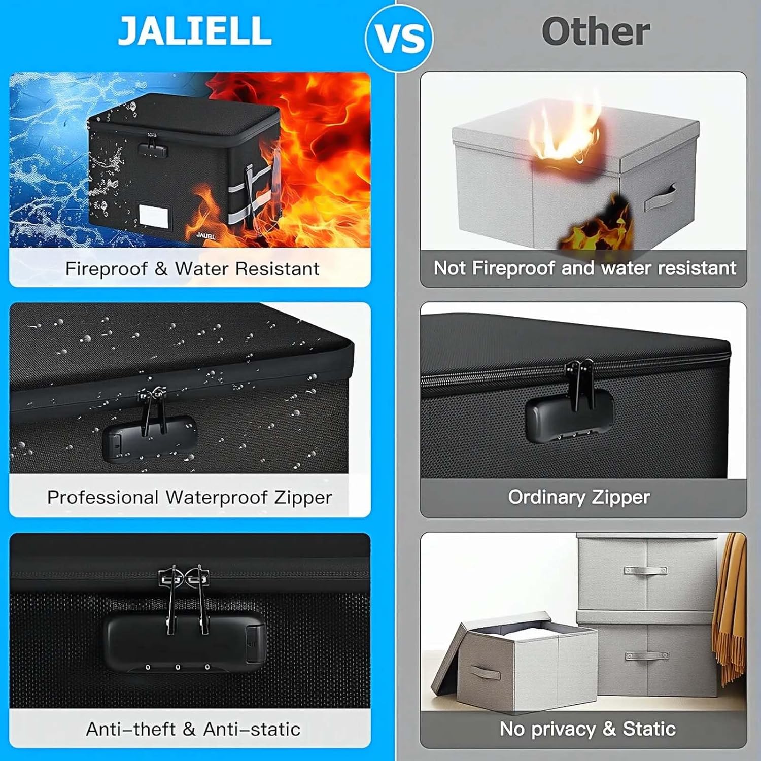 Protect Your Valuables: JALIELL keep researching and developing on fireproof materials,safety technology. We only wish to present the best to customers,to protect your important documents and valuables. If there any problem, please feel free to let us know. We are always here to help you.