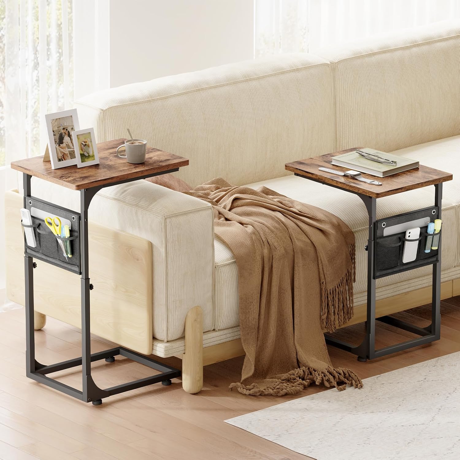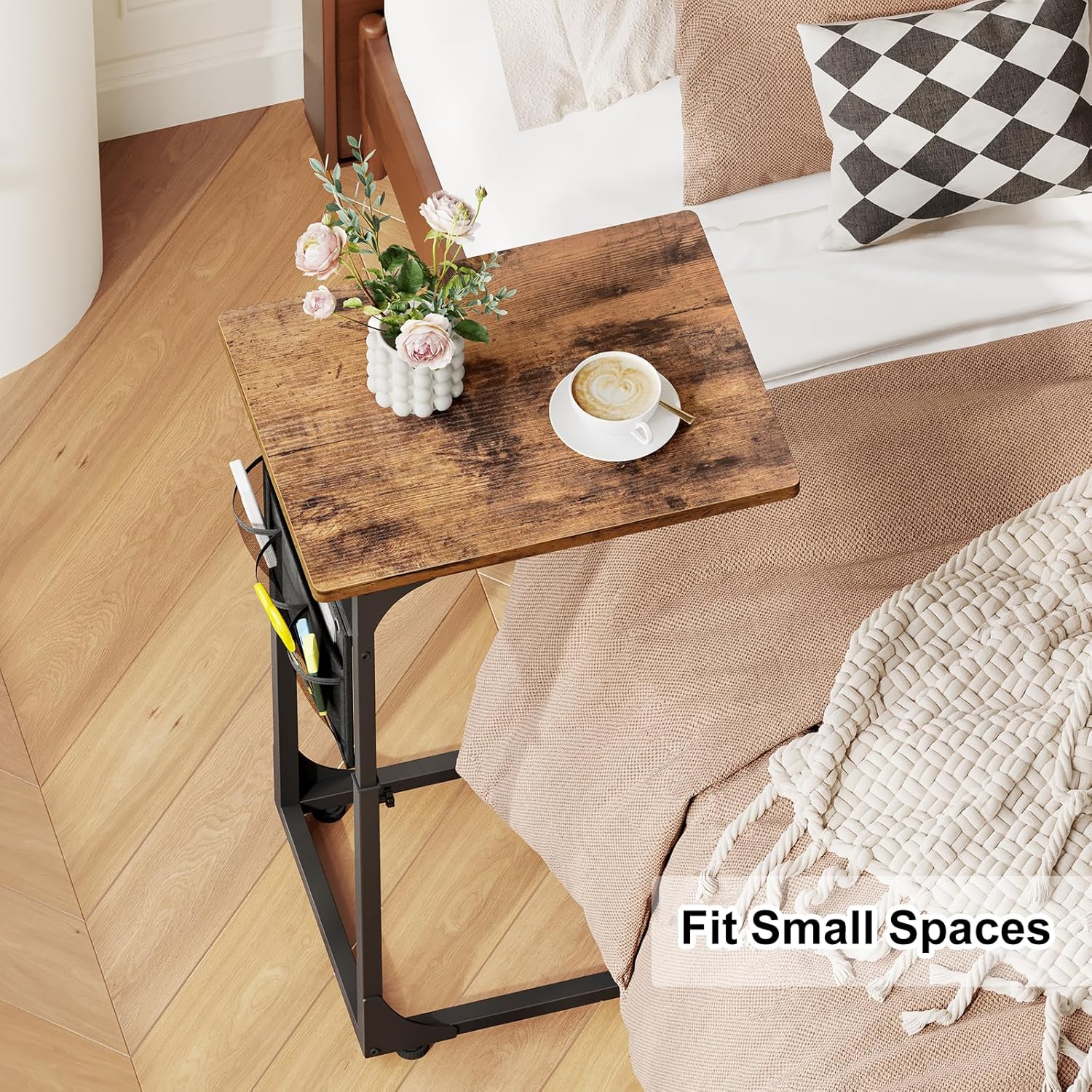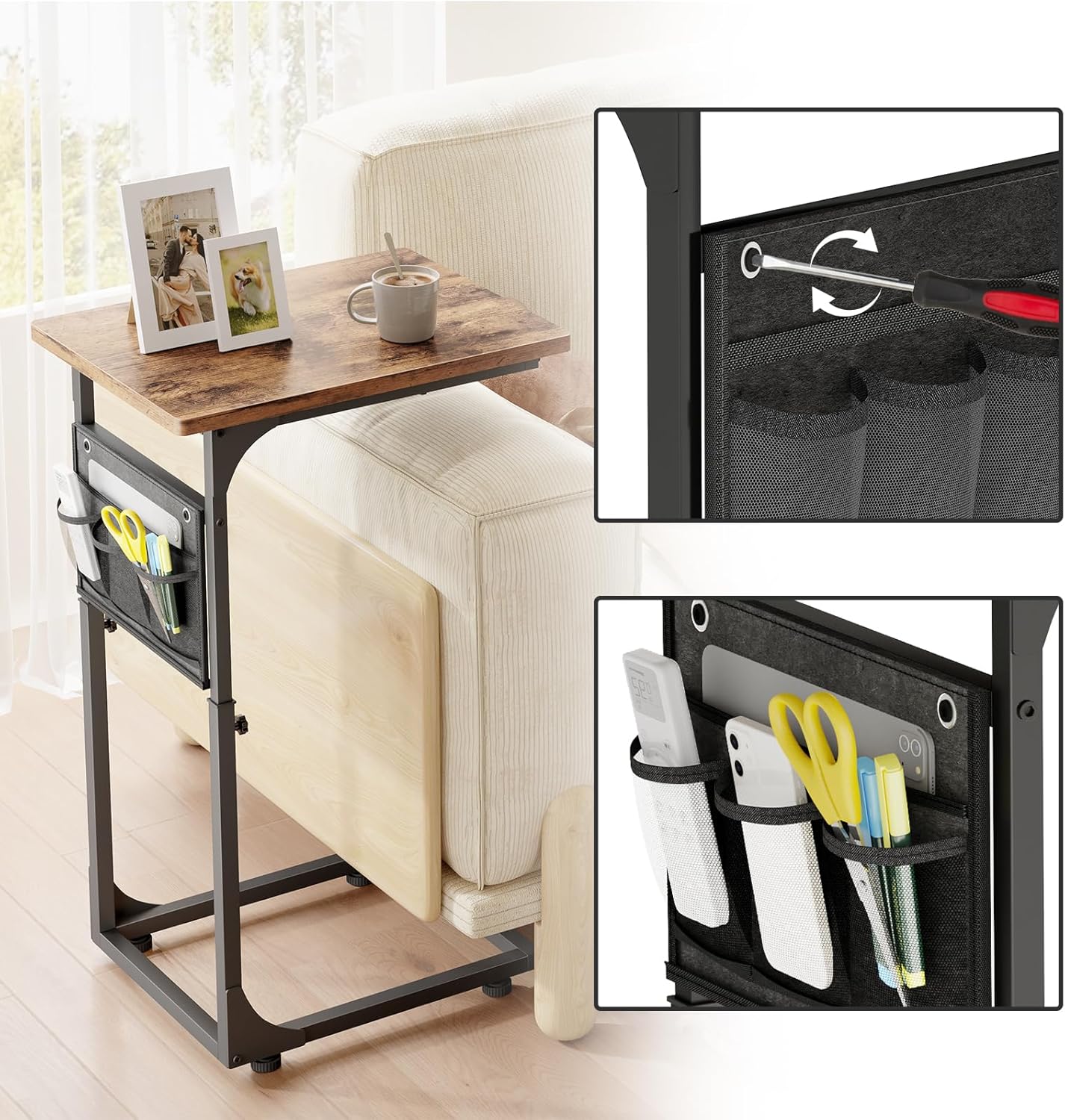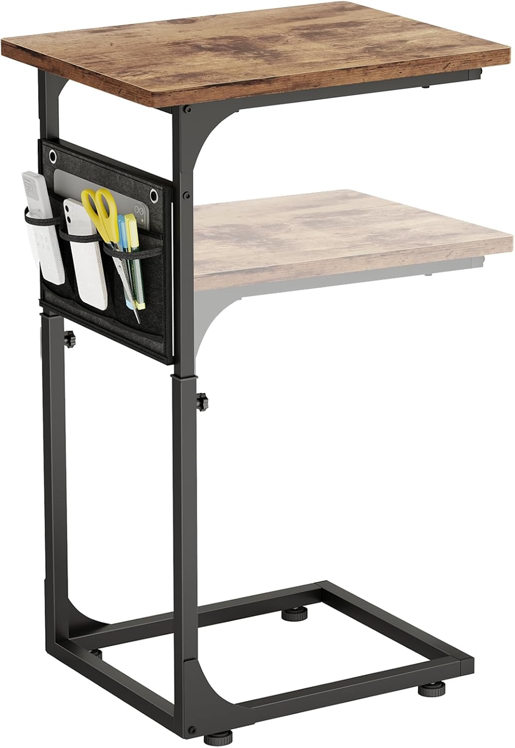 Fixwal C Shaped End Table Adjustable Height Side Table for Couch, TV Tray with Storage Bag Slide Under Sofa Small Tables for Living Room, Bedroom & Office, Rustic Brown