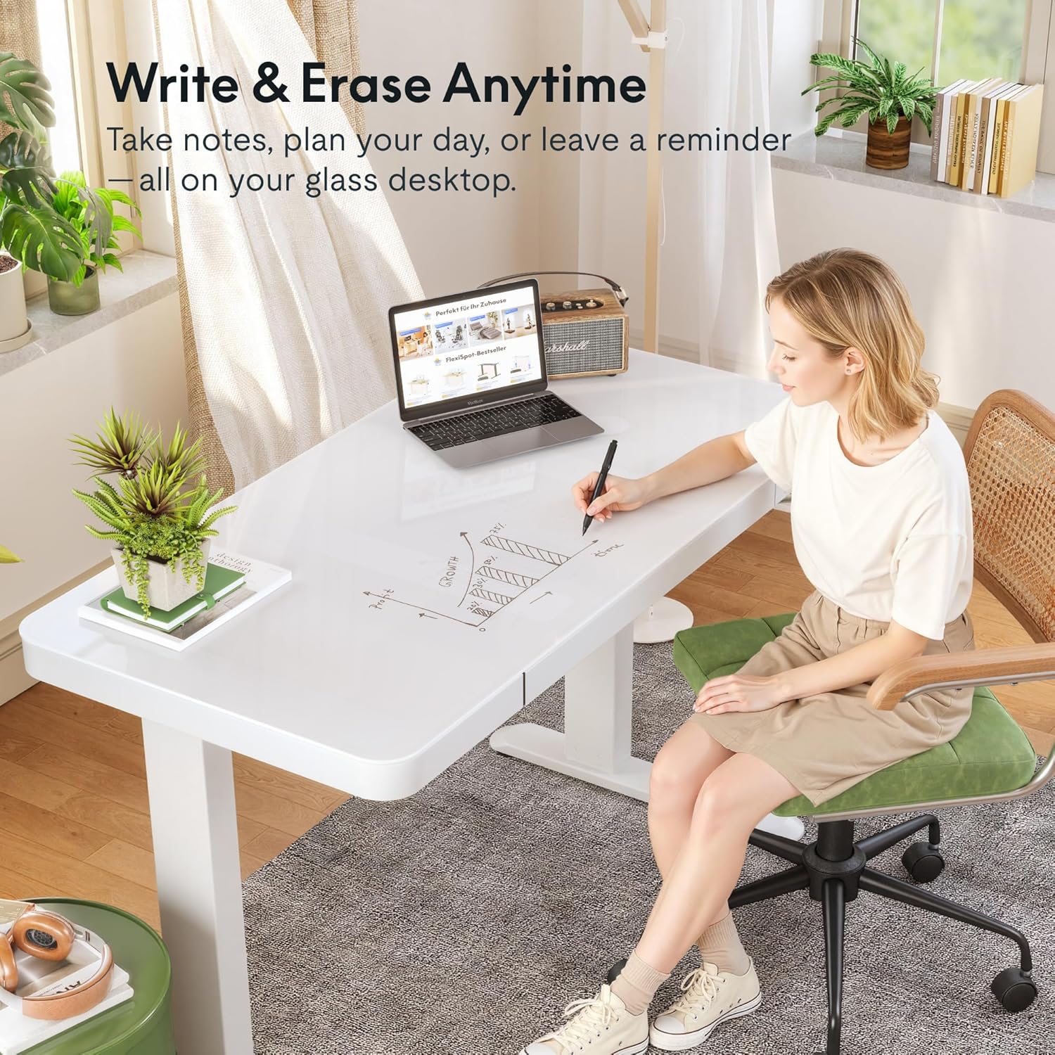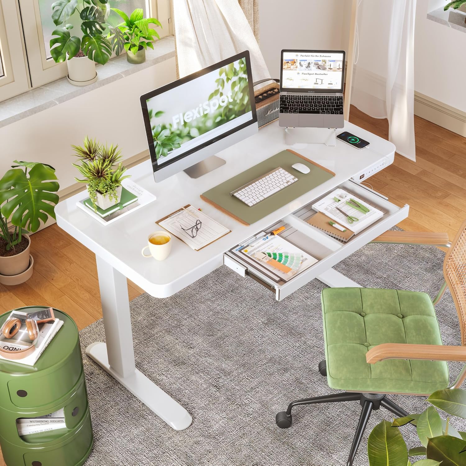 FLEXISPOT Comhar Electric Pure Glass Standing Desk with Drawer Desktop & USB Charge Ports, 48″ Ergonomic Height Adjustable Sit to Stand Desk for Home Office (White, Glass)