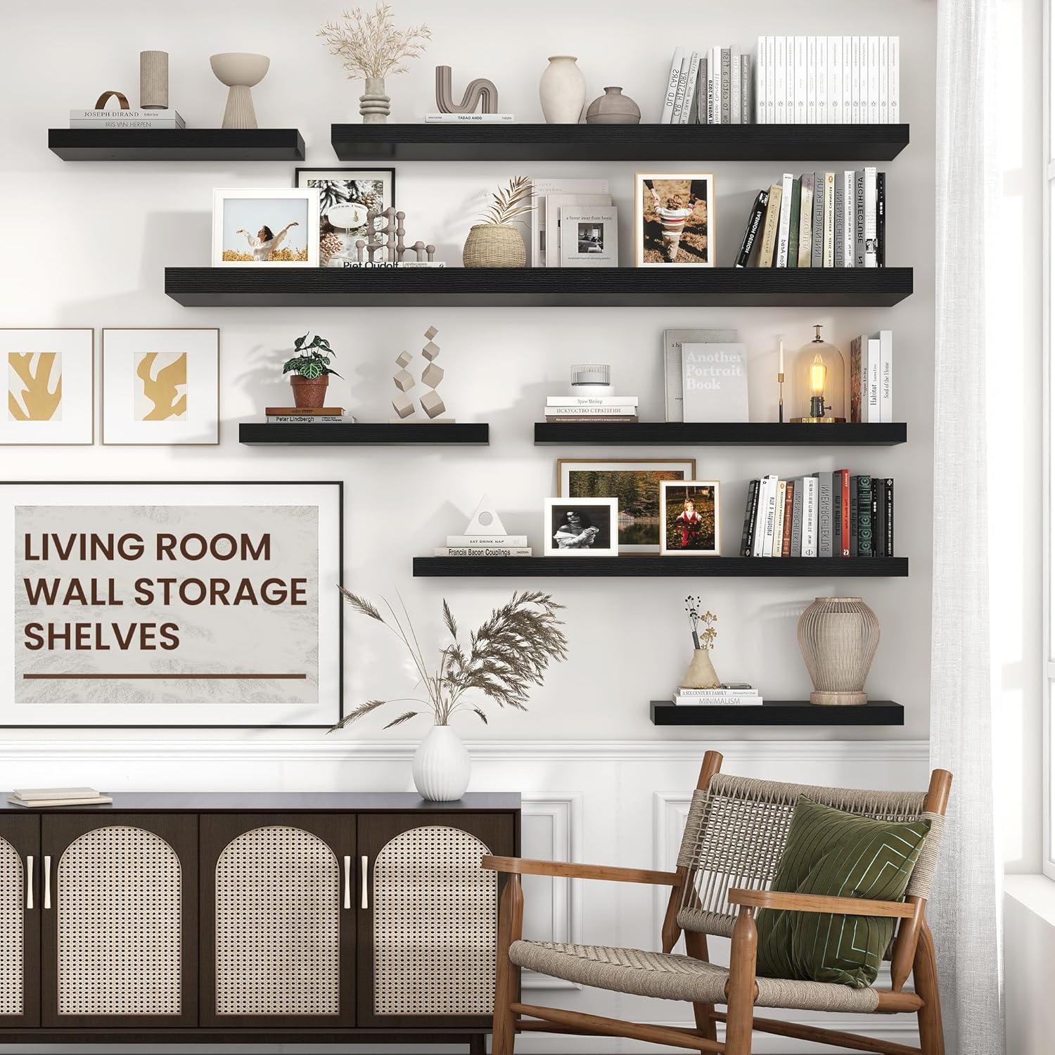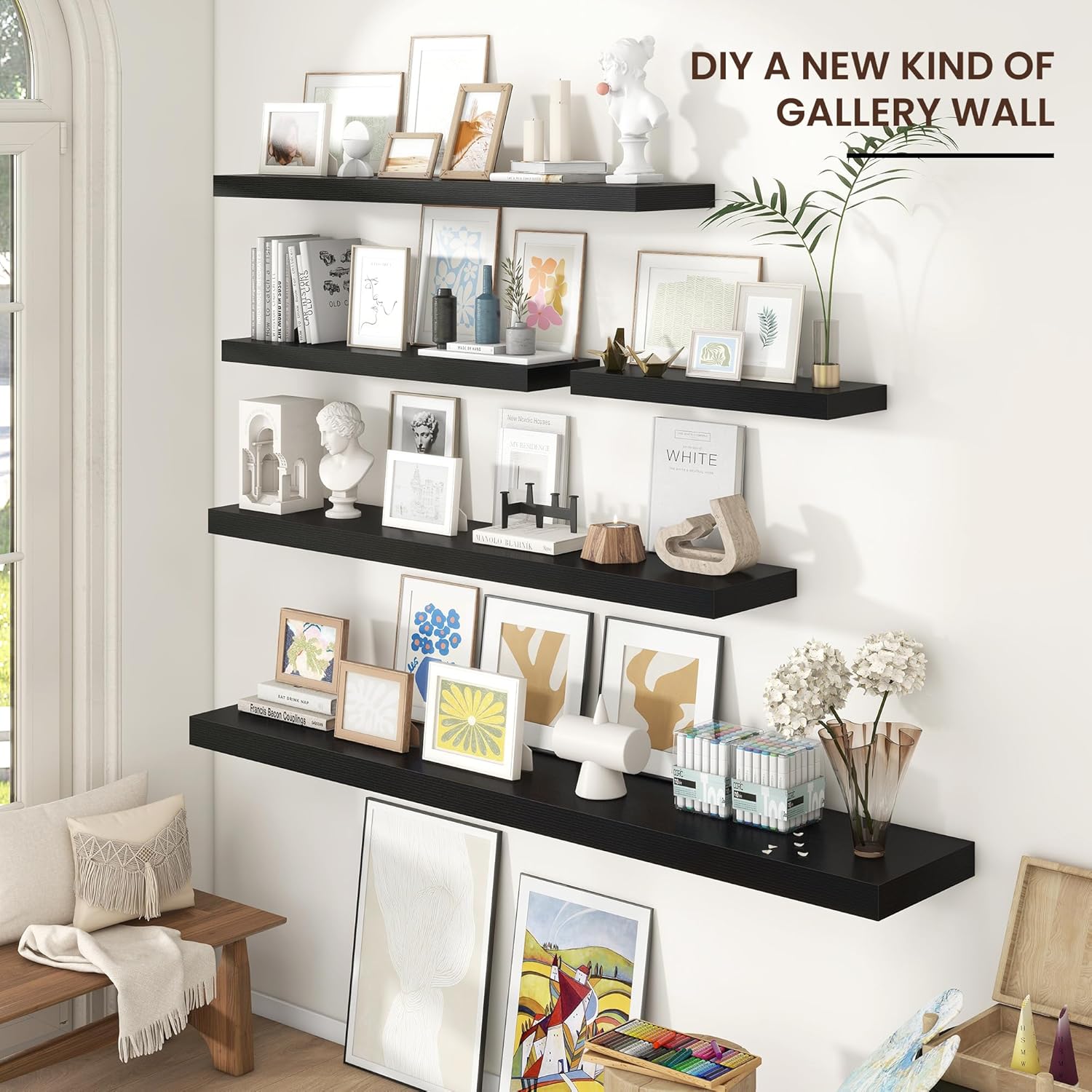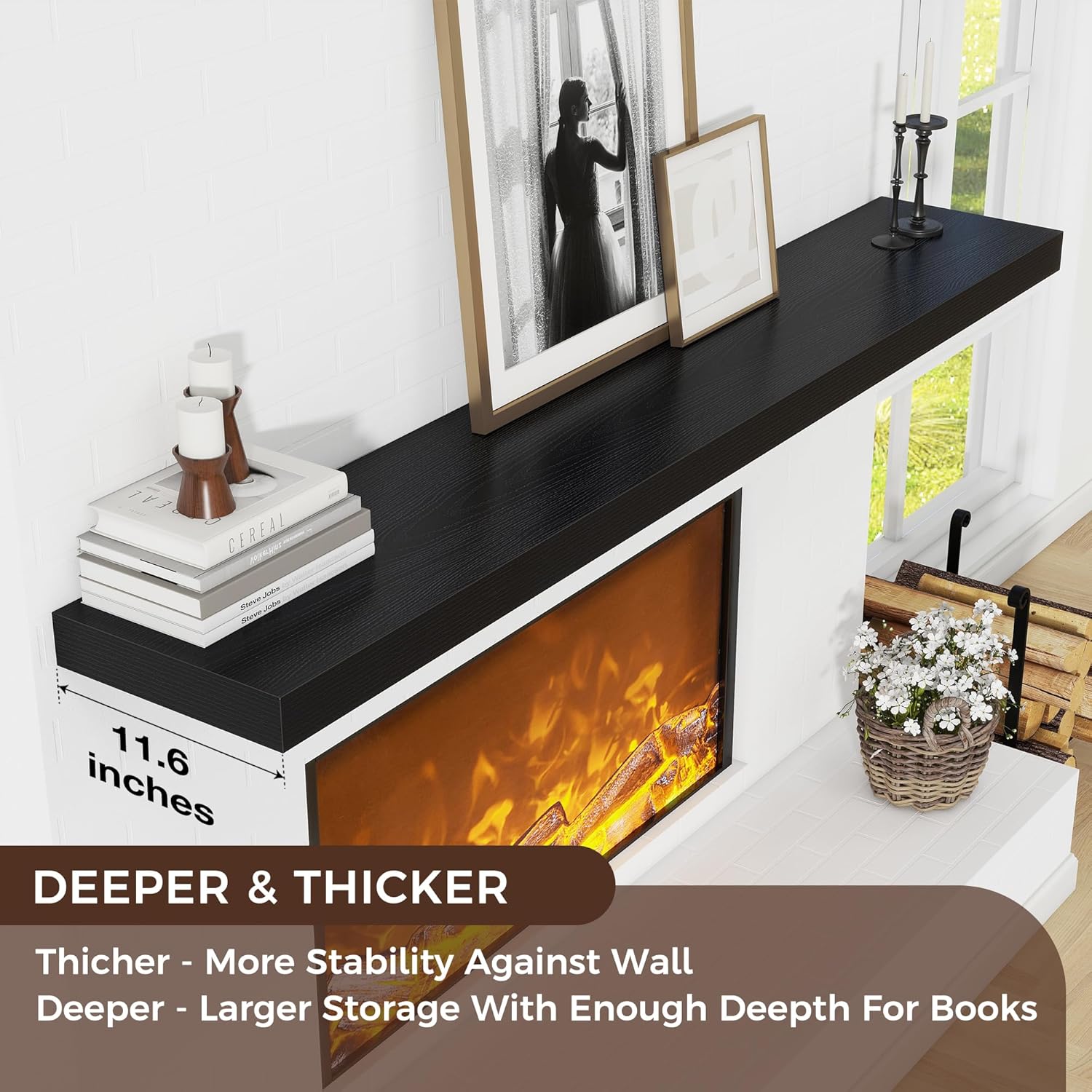 Modern & Rustic Style Options: Crafted from high-quality engineered wood, these floating shelves come in 5 versatile finishes: White, Black, Oak, Walnut, and Rustic Brown. This selection effortlessly adapts to a wide range of home décors, from modern to farmhouse styles.