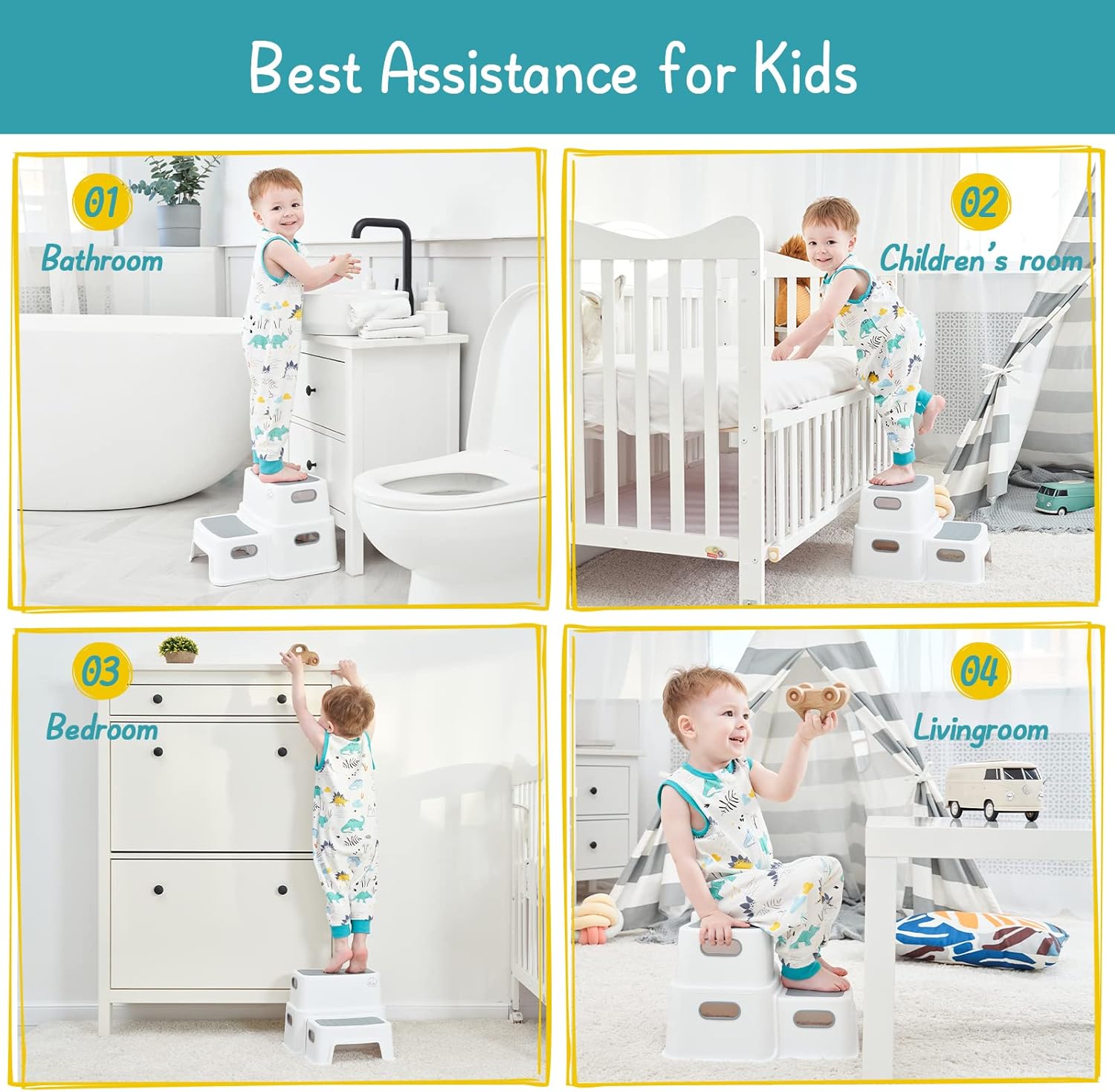 Forbena Toddler Step Stool for Bathroom Sink, 2 Step Stool for Kids Toilet Potty Training, Non-Slip Toddlers Baby Child Kid Plastic Poop Stools with Handle for Kitchen Counter Bed (White-Grey)