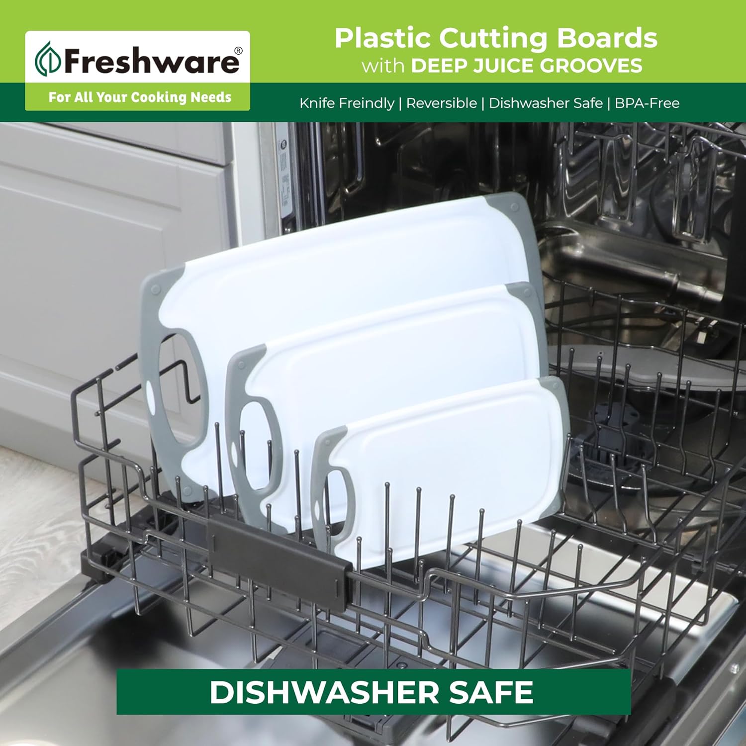 Freshware Cutting Boards for Kitchen, Chopping Board 3-Pack with Different Sizes, Juice Grooves and Non Slip Handles – Reversible, Large Cutting Board Set – Dishwasher Safe – Gray