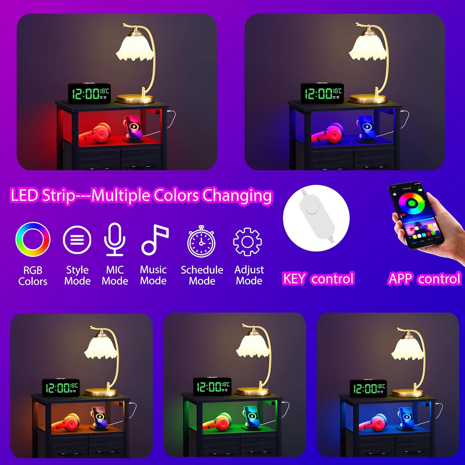 【Smart RGB LED】Enhance your bedroom ambience with our Furnulem nightstand with wood shelf. Equipped with a smart RGB LED light strip, this nightstand offers over 60,000 colors to choose from. Whether you prefer a relaxing mood or want to match your room decor, you can easily adjust the brightness and color using the button or mobile app. With modes like Style Mode, Music Mode, Microphone Mode, and Timer Function, you’ll have endless possibilities to create the perfect lighting atmosphere.