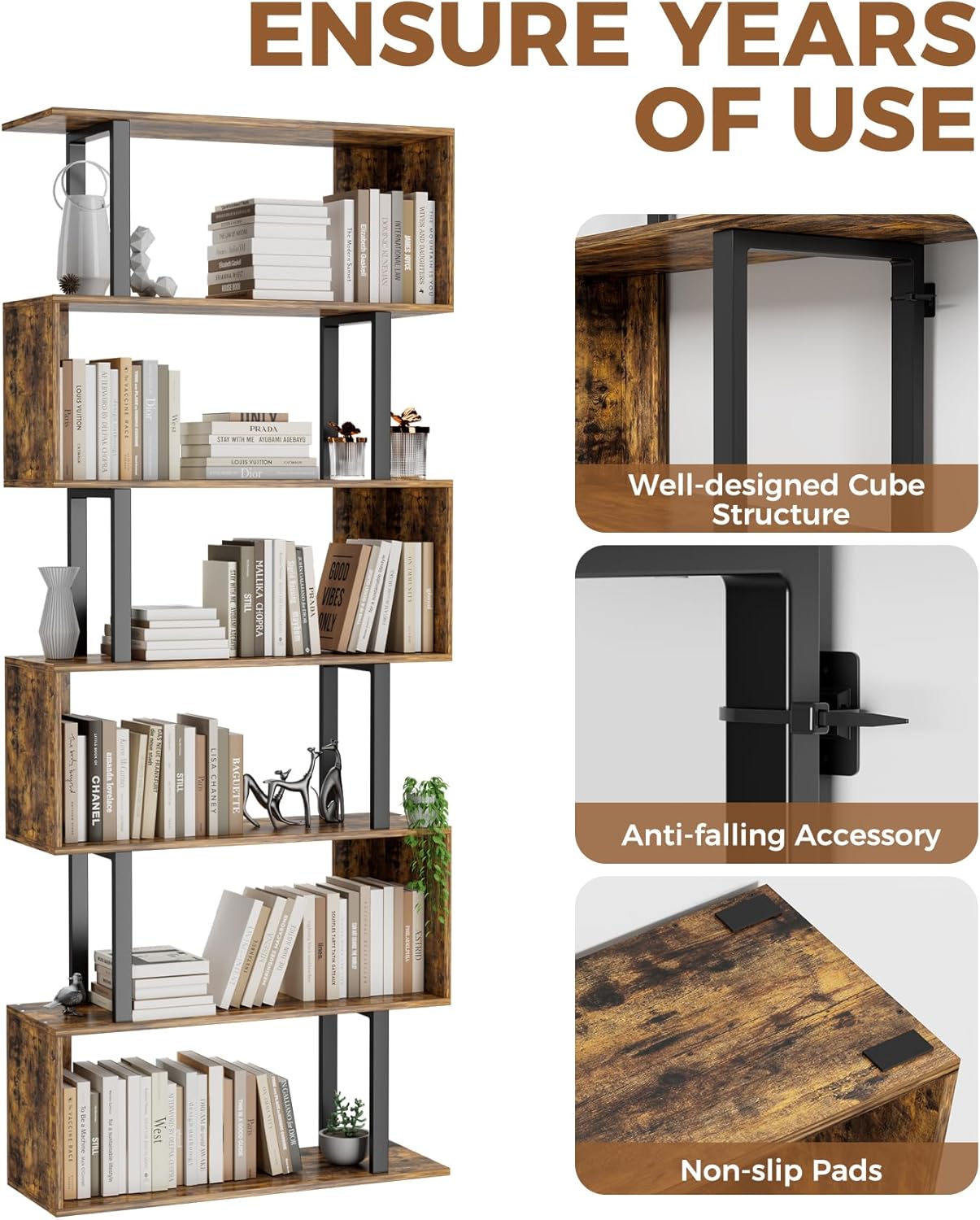 Gadroad 6 Tier Geometric Bookcase,S Shaped Bookshelf, Wood Decorative Storage Shelving, Modern Freestanding Display Shelves, Tall Book Shelf Unit for Living Room Bedroom, Rustic Brown