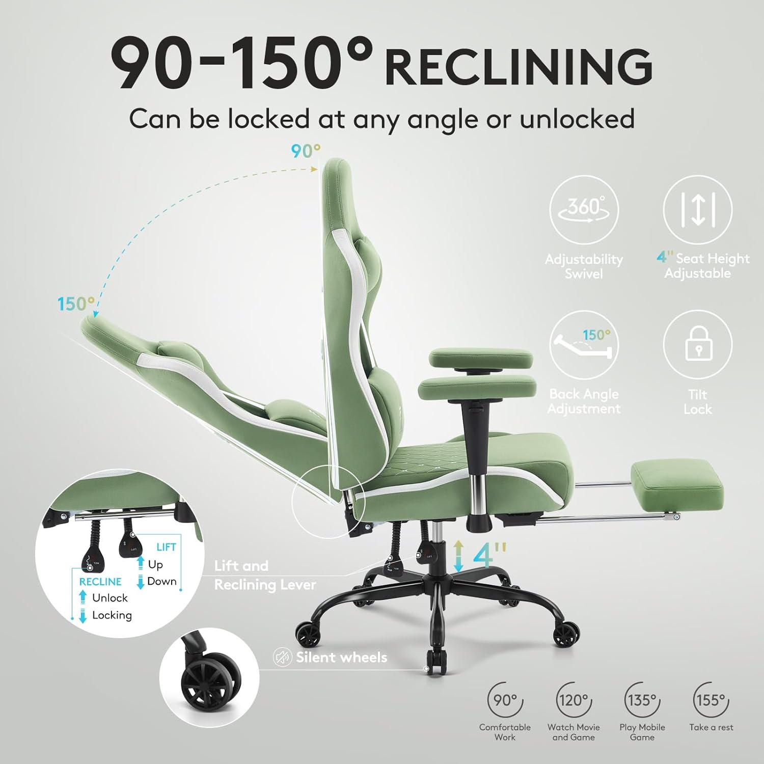 Gaming Chair Breathable Fabric,Computer Office Chair with Footrest,Massage Lumbar Support and Gel Pad,Ergonomic Reclining Gamer Chair with Adjustable Armrests and Spring Cushion Green