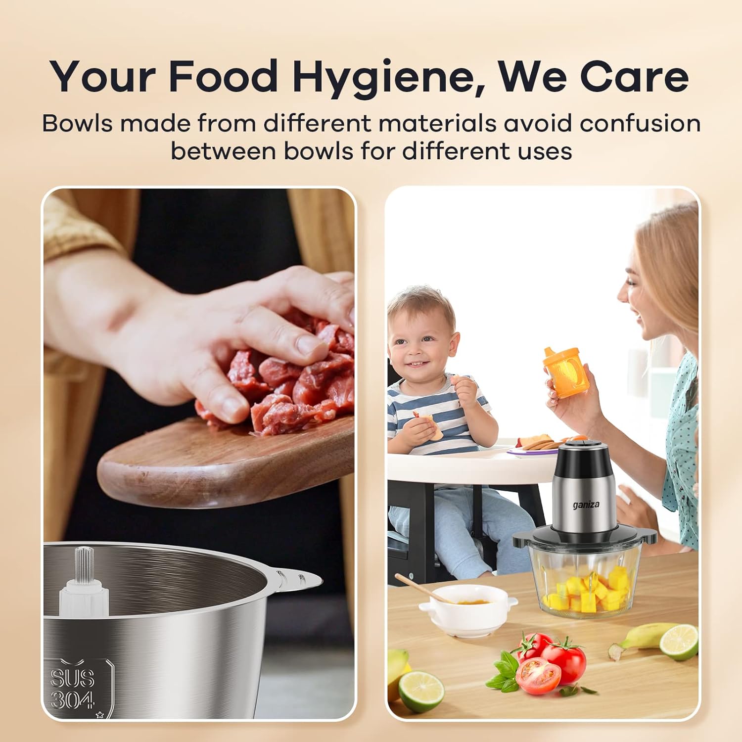【Unlock Versatility with Two Bowls】Your food hygiene, we care. The Mixing Bowls are made from different materials (glass and sus 304 stainless steel) to avoid confusion between bowls for different uses, meat chopper and vegetable chopper, food processor.