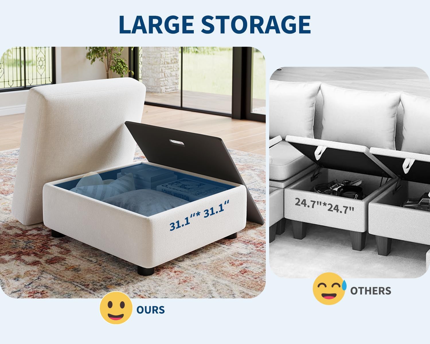 –Smart Storage: The two included storage ottomans provide clever hidden storage, perfect for keeping your living space organized. Store blankets, remote controls, or other essentials while adding extra seating for guests when needed