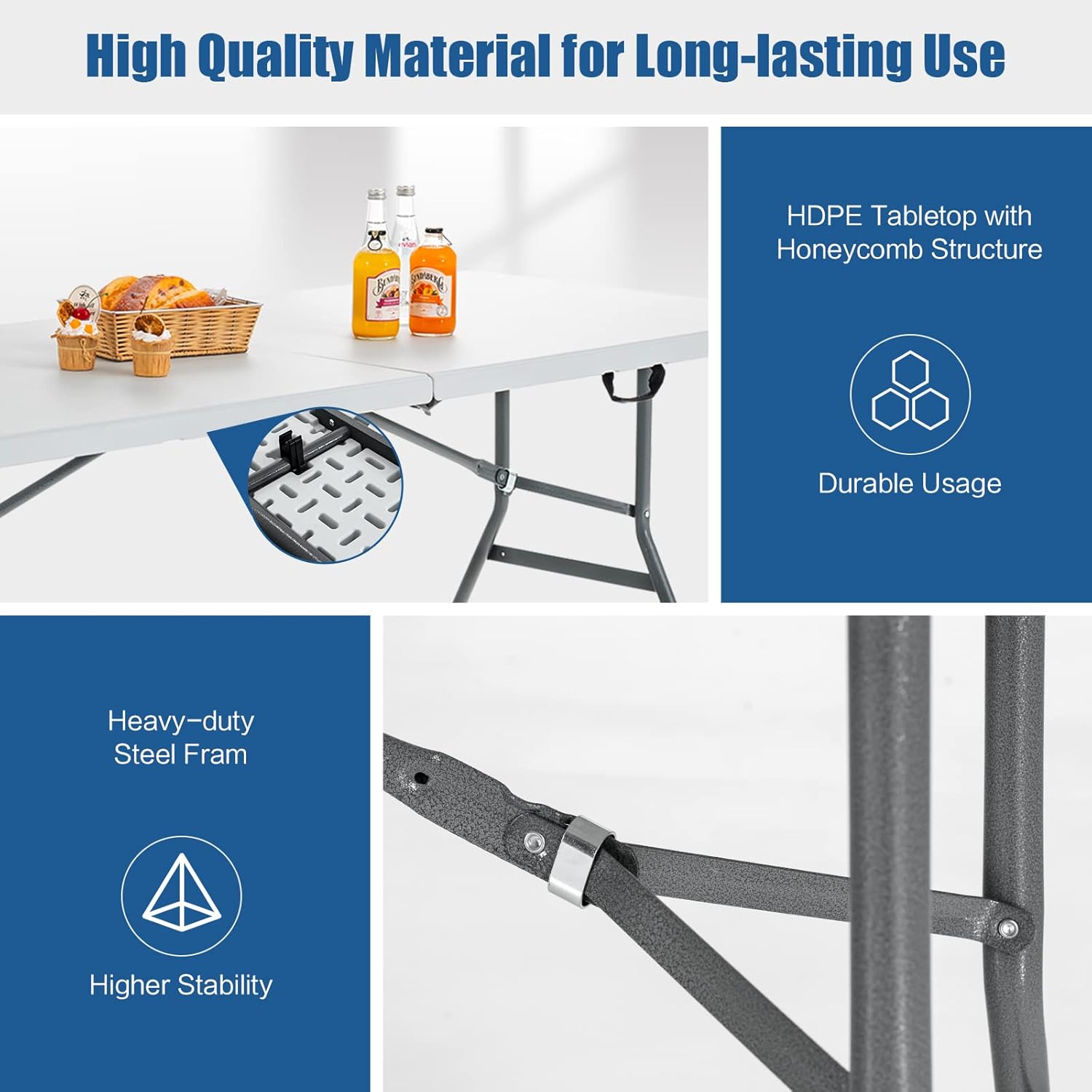 Durable & Stable Construction: The folding table is built with a sturdy steel frame and a high-density polyethylene (HDPE) tabletop with a honeycomb structure, which ensures long-lasting durability and support. With reinforced crossbars and non-slip foot pads, the table can hold up to 330 lbs and provide superior stability.